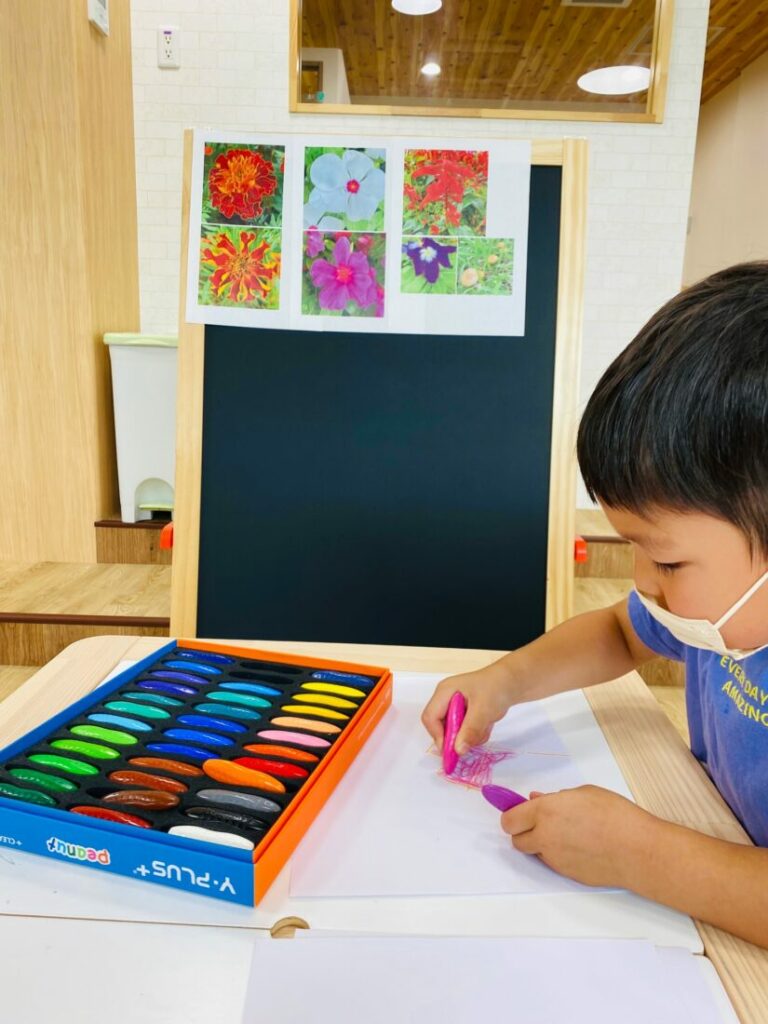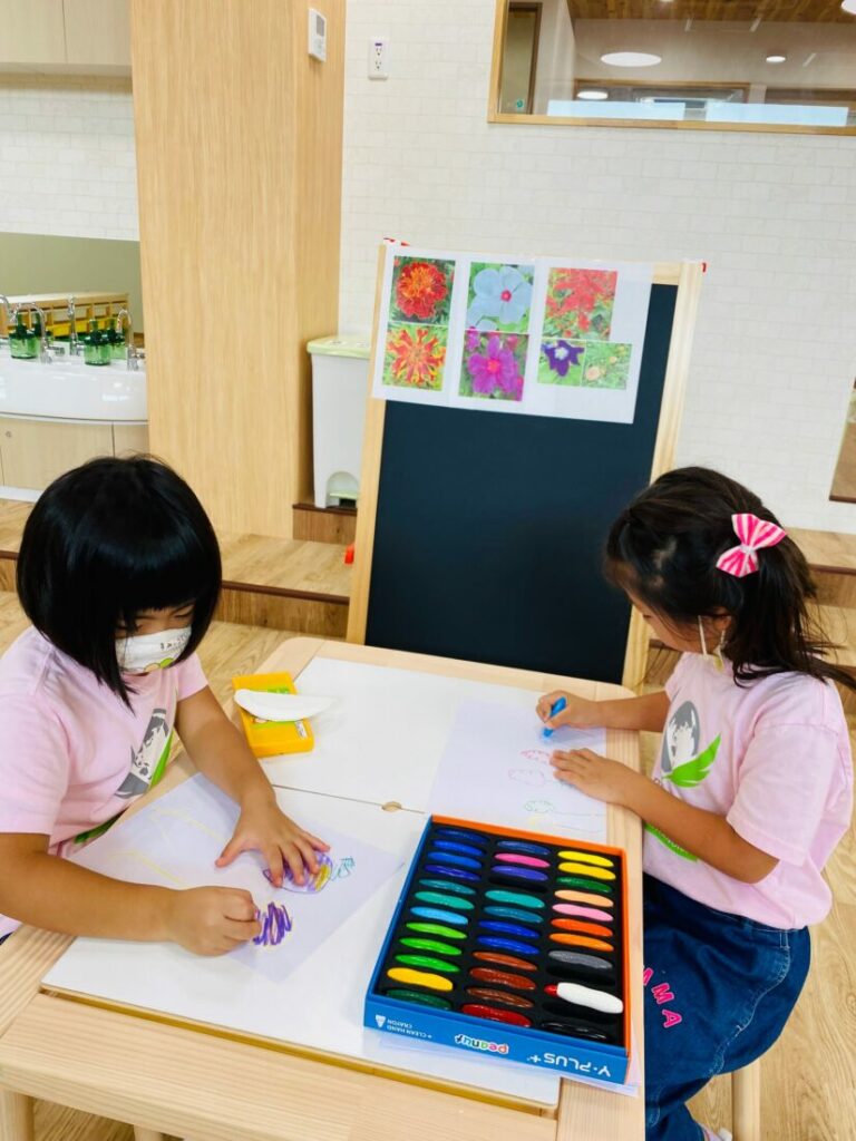 今度はTeacherが公園に咲いていたお花の写真を印刷して、写真を見ながらお絵描きタイムです。