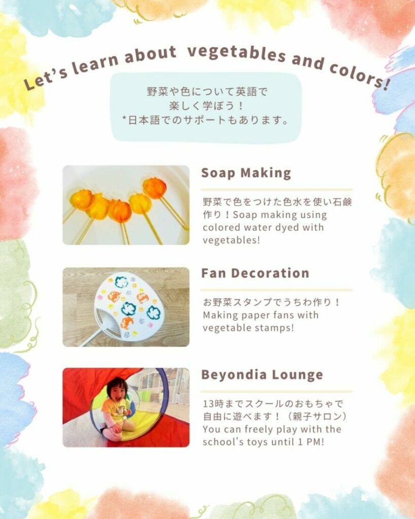 We will create soap using vegetable-colored water and decorate fans with vegetable stamps.