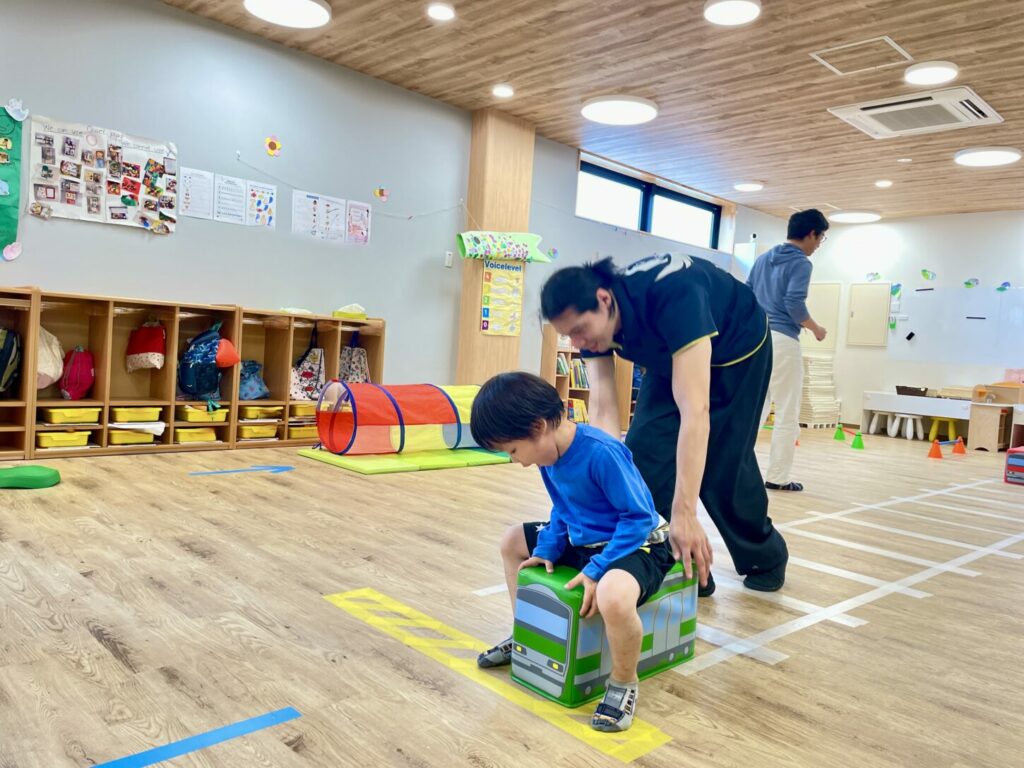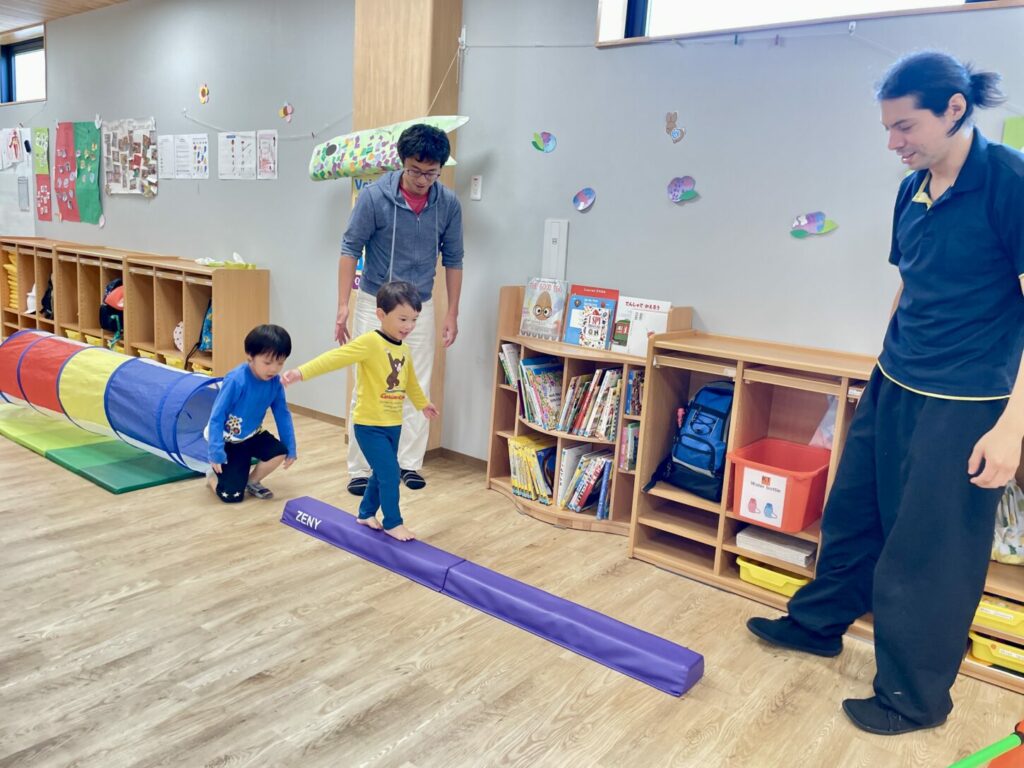 今回は学校全体を開放し、さまざまなアクティビティコーナーを設けました。中でも人気だったのは大きな障害物コースで、トンネル、飛び石、汽車、マットなどを使って、親子で一緒にコースを楽しみました。