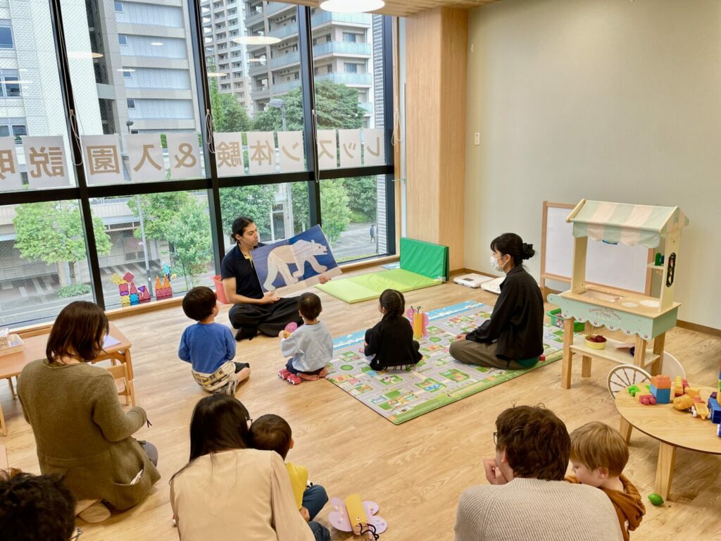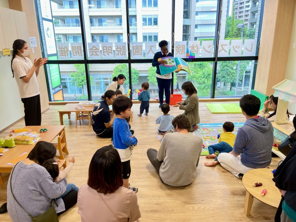 さらに、30分ごとにストーリータイムを開催し、保護者の方とお子さまが一緒に英語の絵本を楽しみながら、英語環境に親しむ時間も設けました。