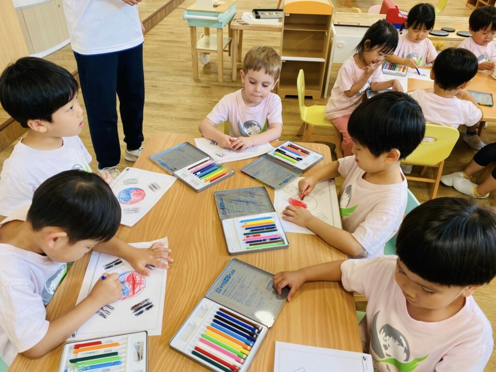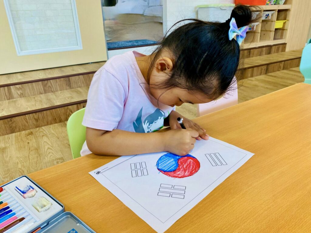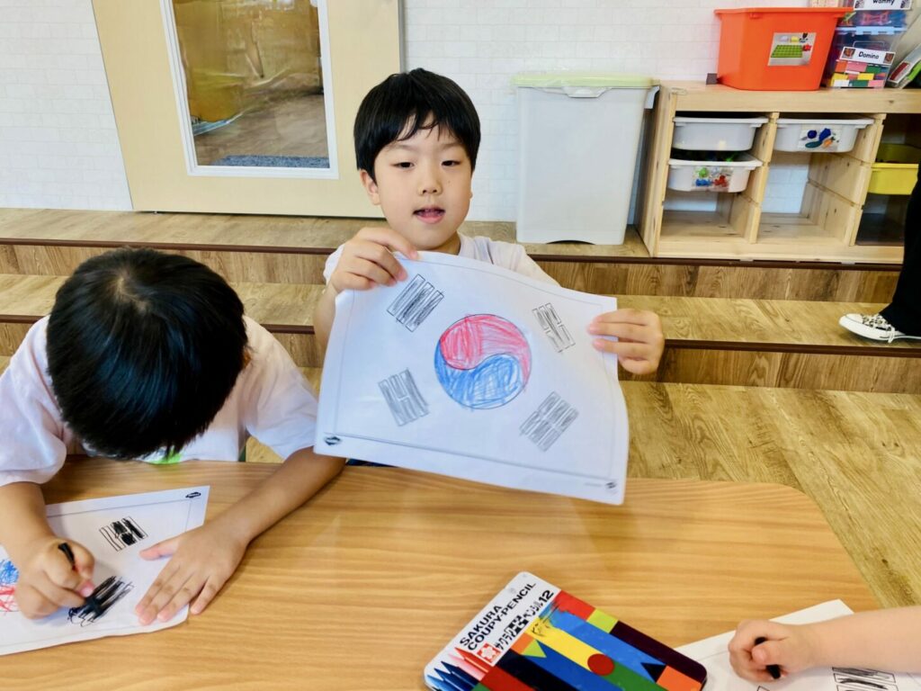 To build connections, we compared the South Korean flag with the Japanese flag, noting that both flags include circles. The children then enjoyed coloring their own version of the South Korean flag.