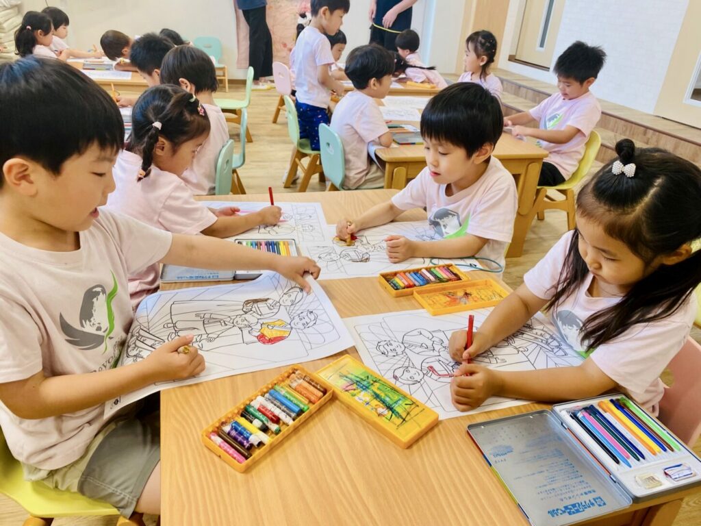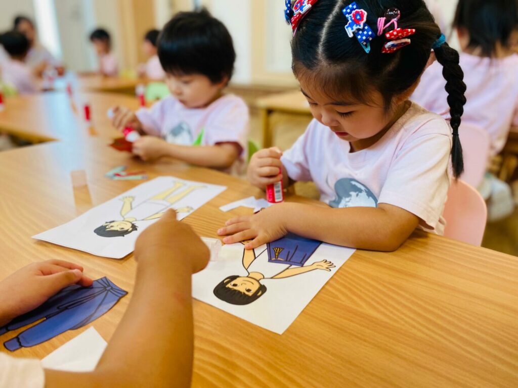 続いて、伝統的な衣装について学びました。子どもたちは、韓国の伝統衣装であるハンボクが、日本の浴衣、着物、甚平とは異なることに気づきました。その後、ハンボクのぬり絵をし、クラフトの時間には自分たちでハンボクを作りました。アートを通して文化を表現することができた活動でした。