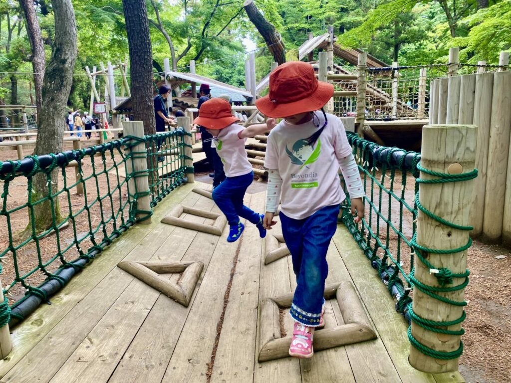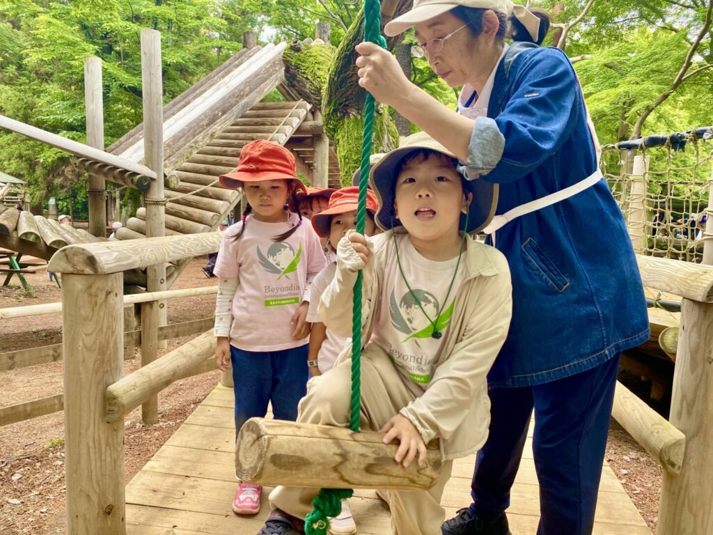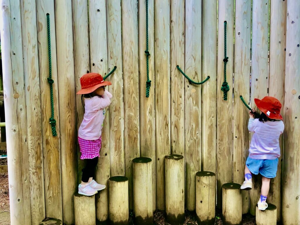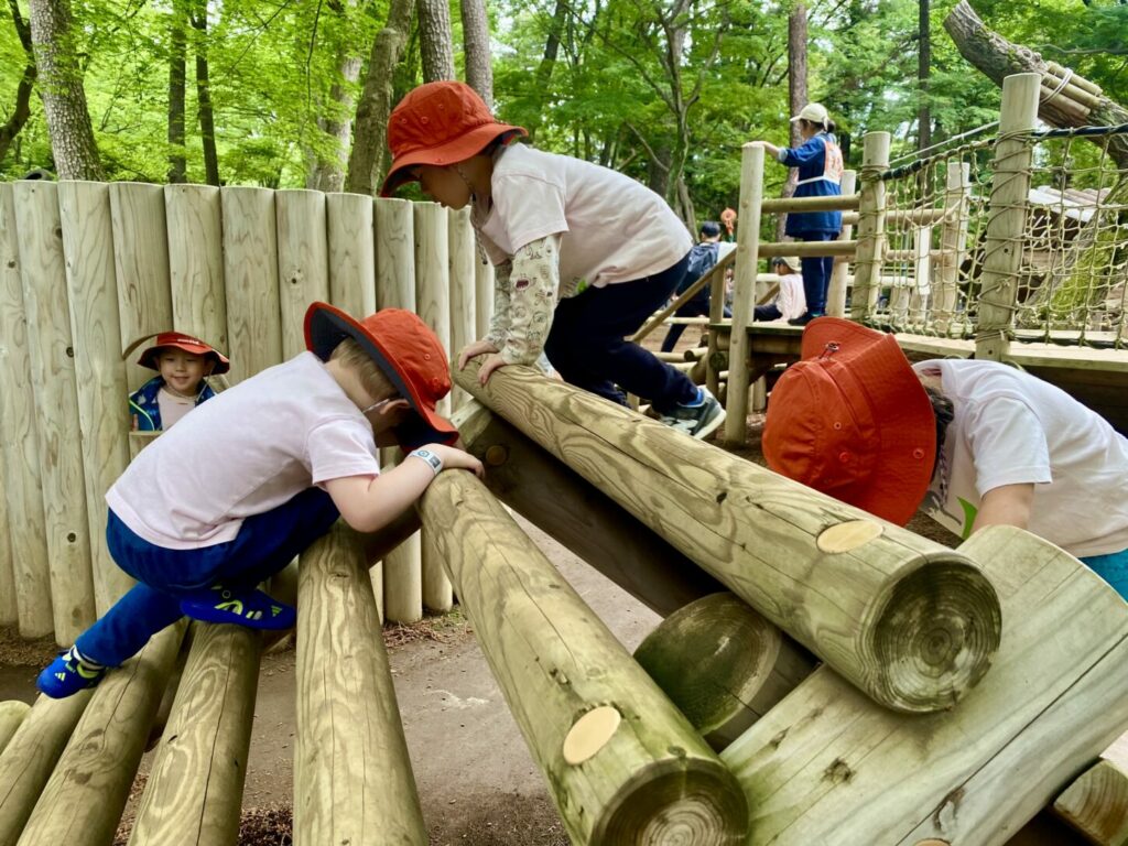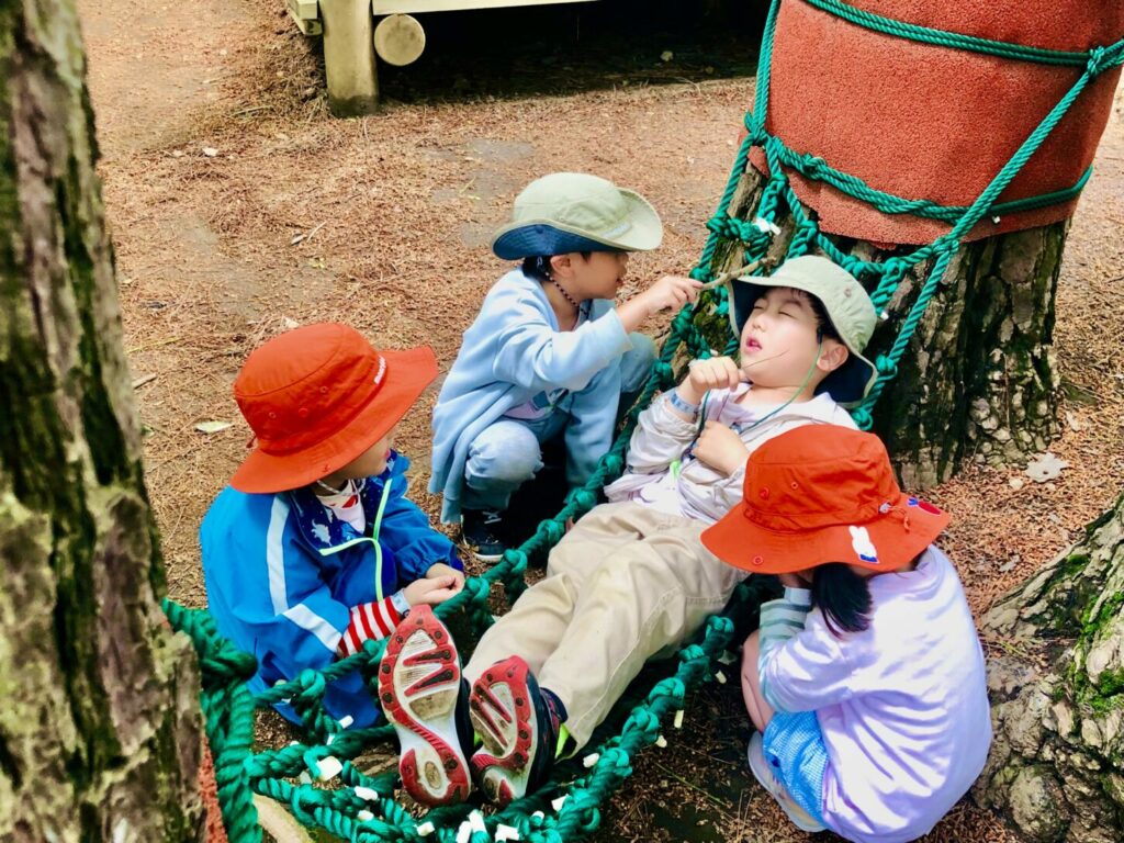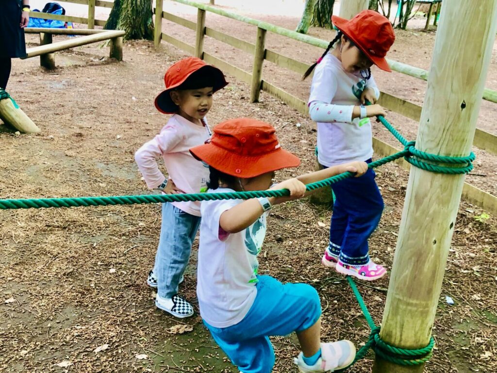 次は、小さなクライミング遊具がたくさんあるエリアに移動しました。そこでは、ロープブランコが一番人気でした!子どもたちは順番を守って楽しく遊びました。また、医者と患者のごっこ遊びもして、子どもたちの想像力に感心しました。