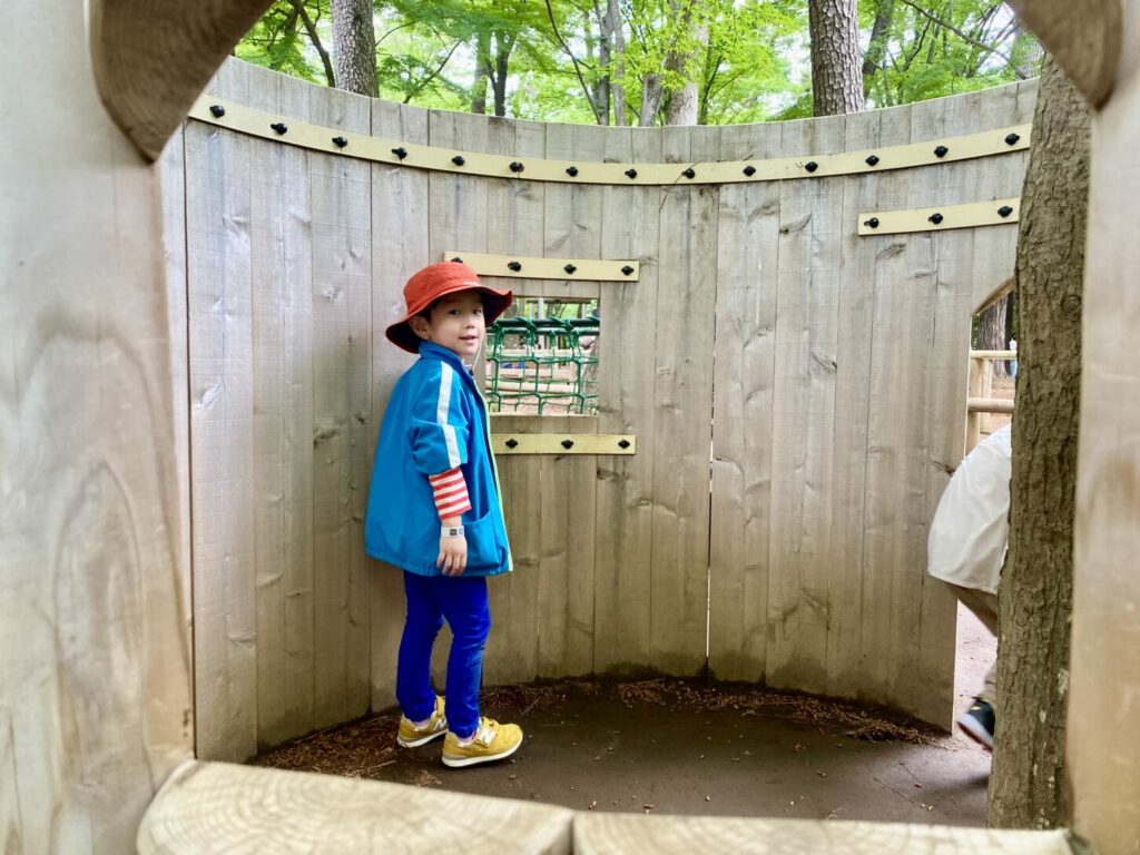 最初に遊んだのは、大きなジャングルジムのある遊び場です。子どもたちはトンネルをくぐったり、すべり台をしたり、たくさん体を動かして楽しみました。ごっこ遊びもたくさんして、お友だちや他の子どもたちにも優しく接していました。