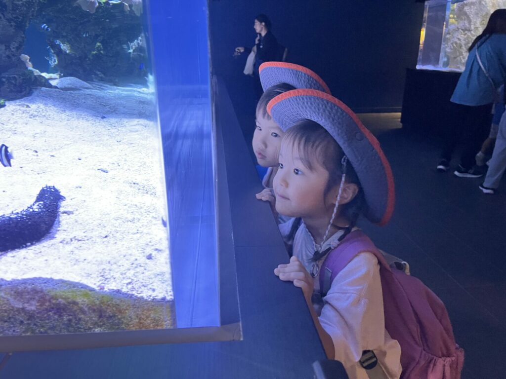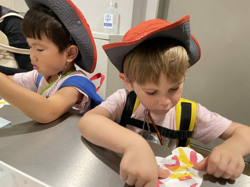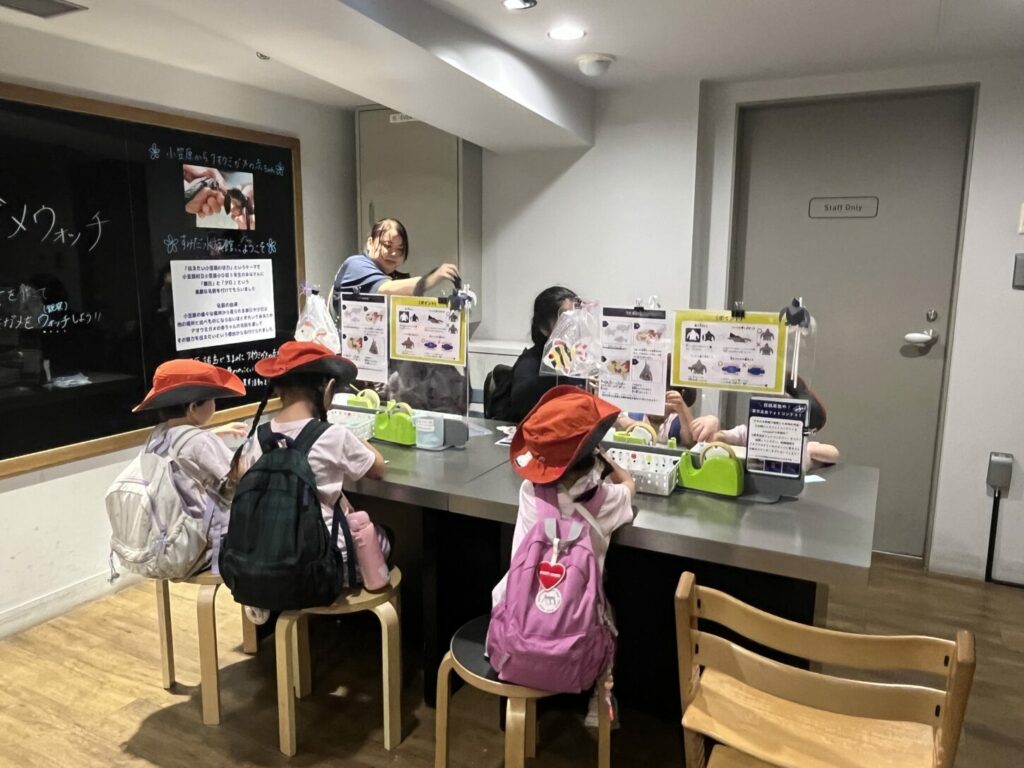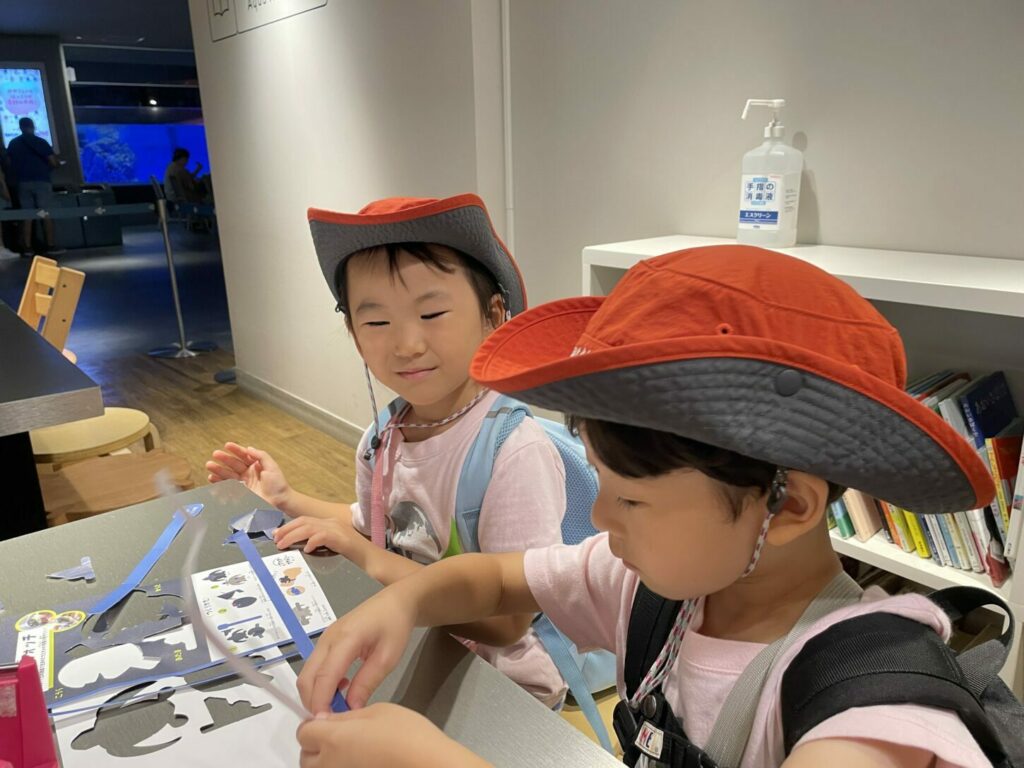また、水族館でのワークショップにも参加し、実際に手を動かしてアート活動を行いました。コラージュ技法で魚を作る子や、カメのリストバンドを作る子もいて、それぞれの創造性を発揮して思い出に残る作品を完成させました。その後、サメ、アザラシ、金魚なども観察し、さらに興味と好奇心を広げました。