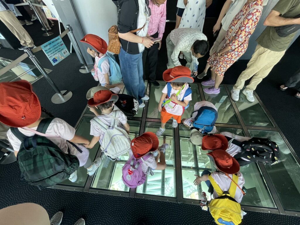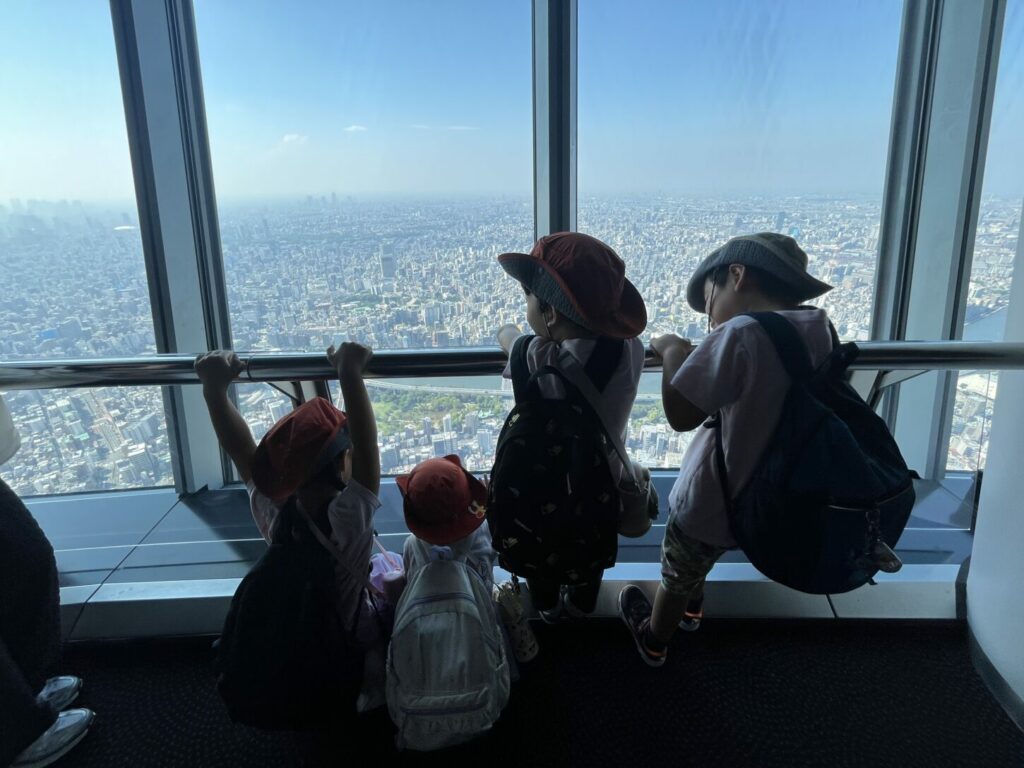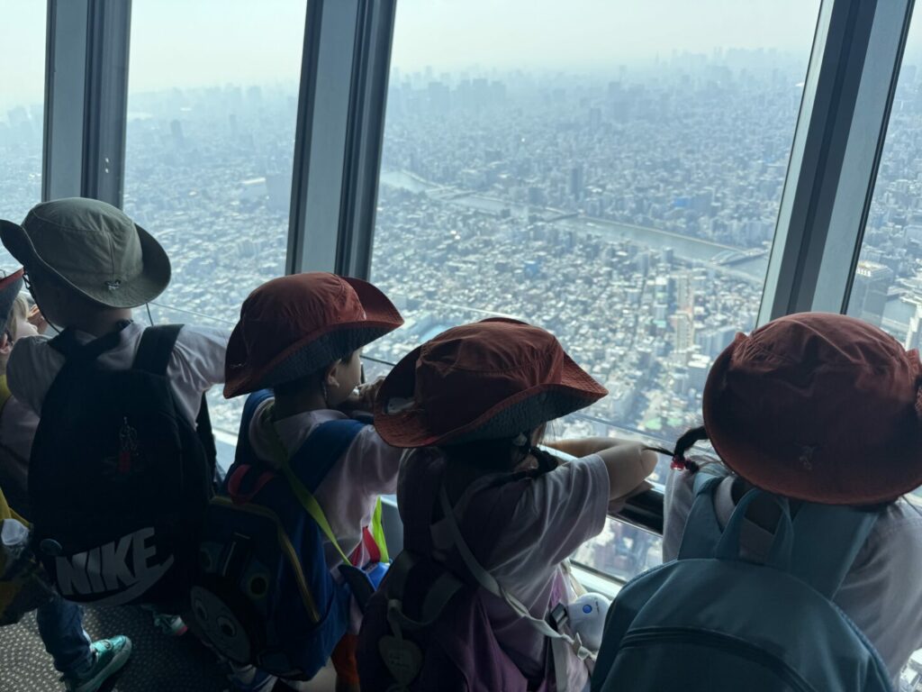 水族館を後にした子どもたちは、東京スカイツリーを眺めながら屋外で昼食を楽しみました。その後、展望台に上り、上からの景色に大興奮。東京タワー、富士山、ディズニーランドなどを探しましたが、霧がかかっていてはっきりとは見えませんでした。しかし、近くを飛んでいたヘリコプターを見つけ、大喜びしていました。