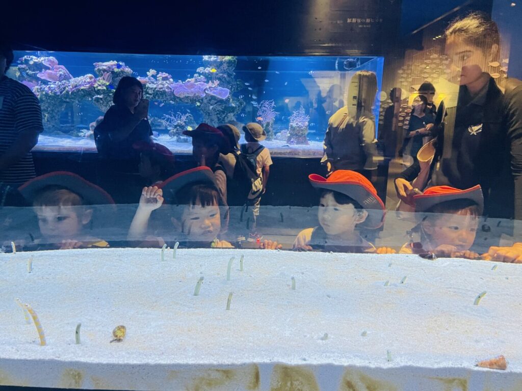 The trip began with a visit to Sumida Aquarium, where the children observed a variety of fascinating sea creatures. They excitedly described the size, shape, and color of the fish. Some children pointed out, “It’s a big fish!” and “Look, it’s a small jellyfish!” They were able to recognize sea animals such as pufferfish, jellyfish, eels, starfish, sharks, and manta rays. The children also commented on their movements, noticing which fish were fast and which were slow, and even expressed ideas about their feelings, saying things like “This fish looks happy” or “This fish is sad.” One of the highlights of the aquarium was watching the eels being fed. The students were amazed when the eels suddenly emerged from the sand to eat, and they noticed how some were short while others were long. The penguins were another favorite, and the children enjoyed observing their behavior while predicting whether they looked happy, sad, angry, or hungry.