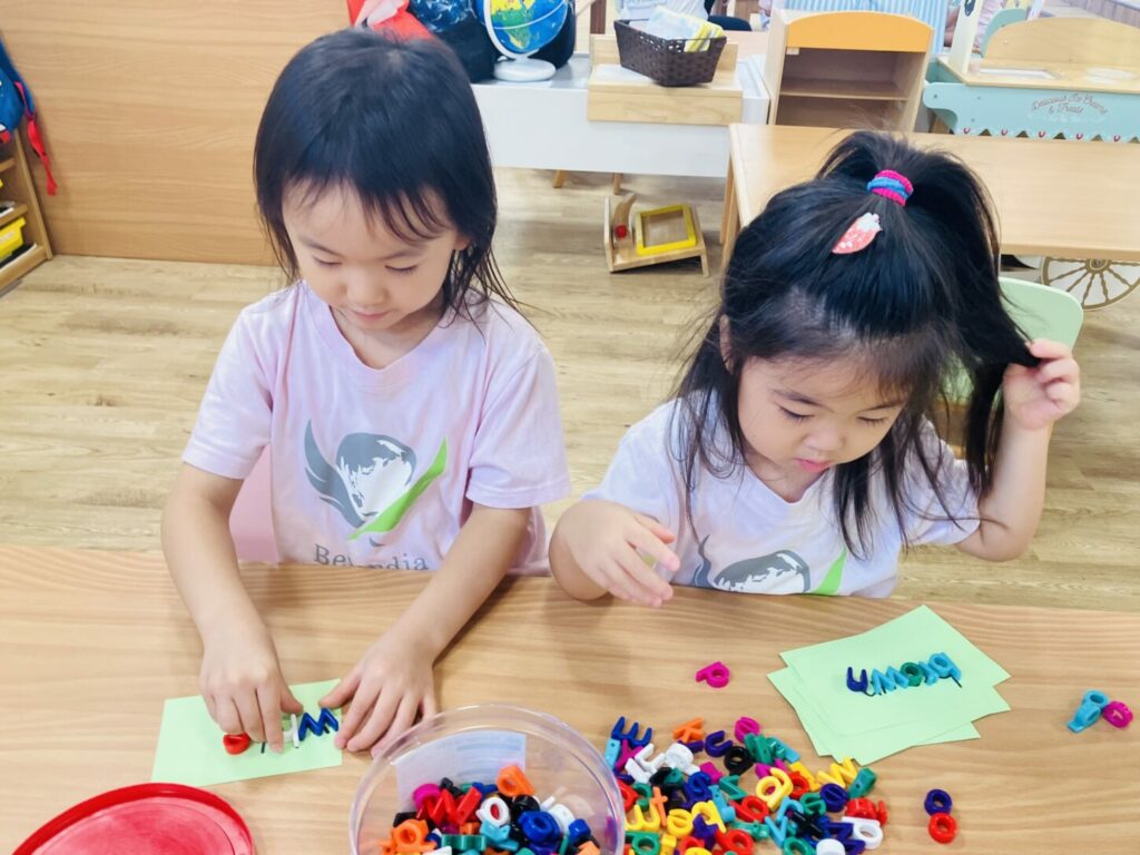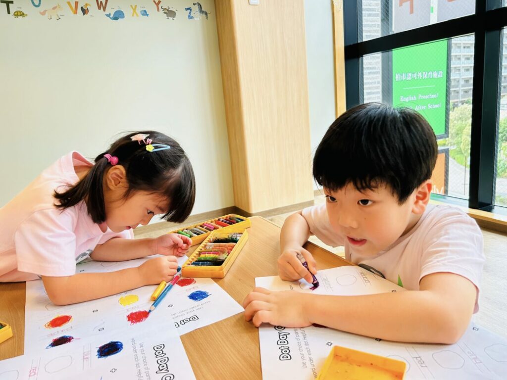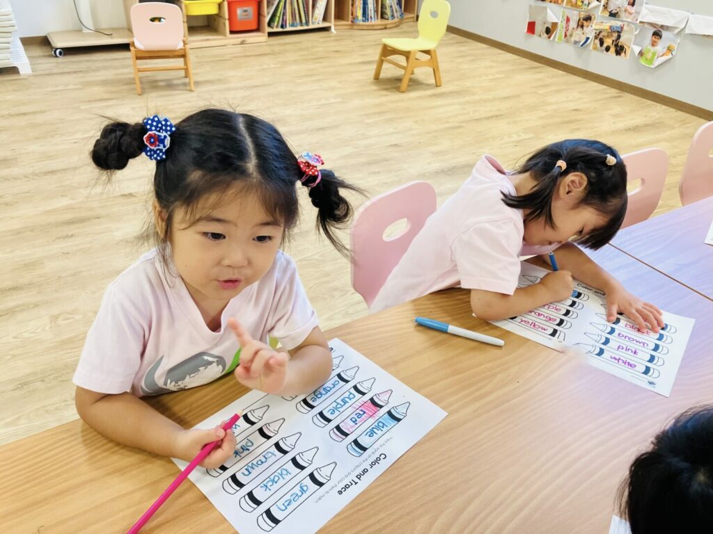 その後、色のフラッシュカードを紹介し、スペリング、フォニックス、単語認識を練習しました。これにより言語発達と視覚的表現を結びつけました。子どもたちは色の名前をなぞったり、絵とマッチさせたり、ぬりえ活動を通して創造性を表現しました。