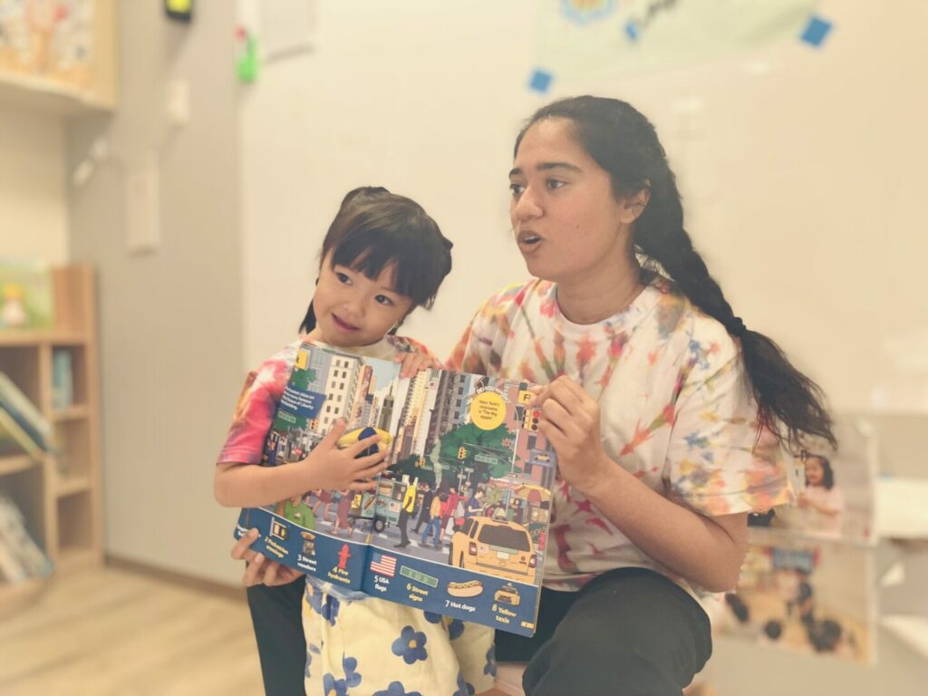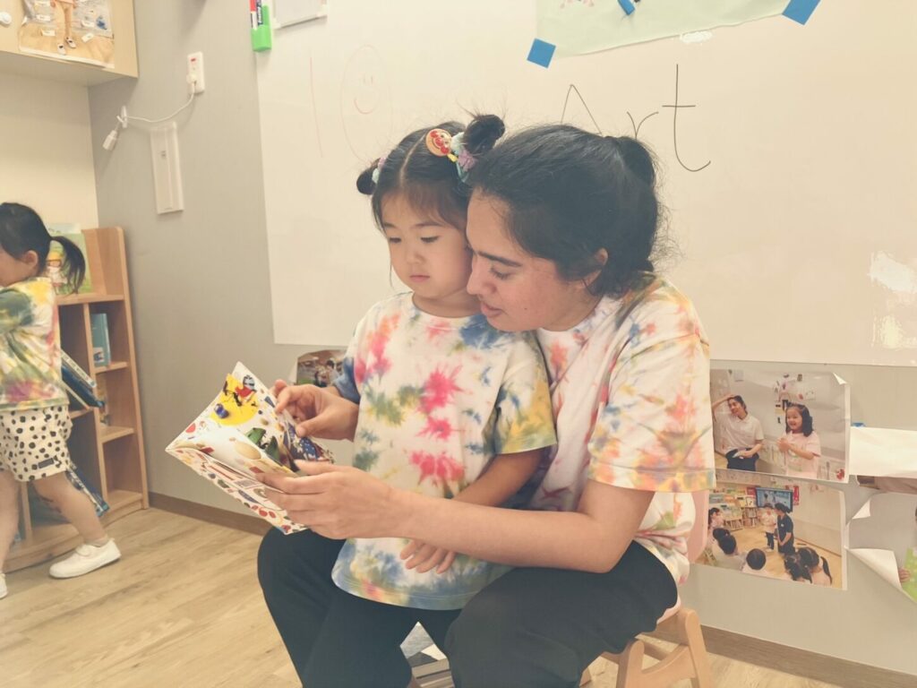 興味を引き出すために、まず読書コーナーの本にある絵画を見せて「どんな色が見える?」というオープンエンドの質問をしました。子どもたちは「赤」「白」「青」といった答えを元気よく答え、色を認識し名前を言うことについての深い会話へとつながりました。