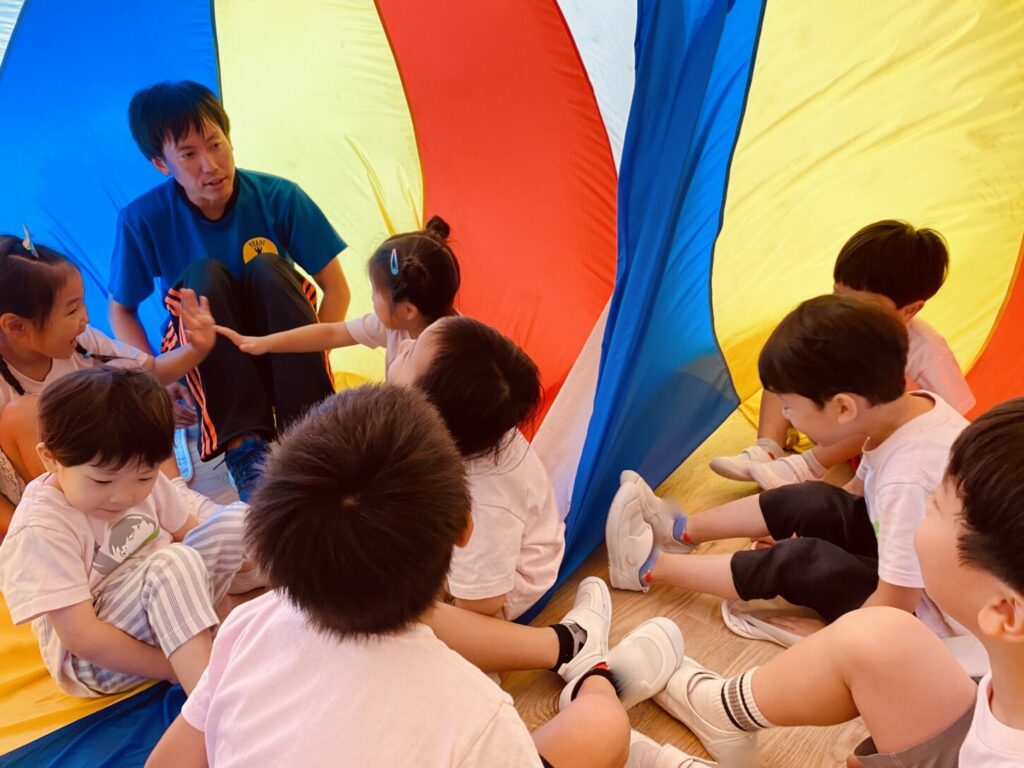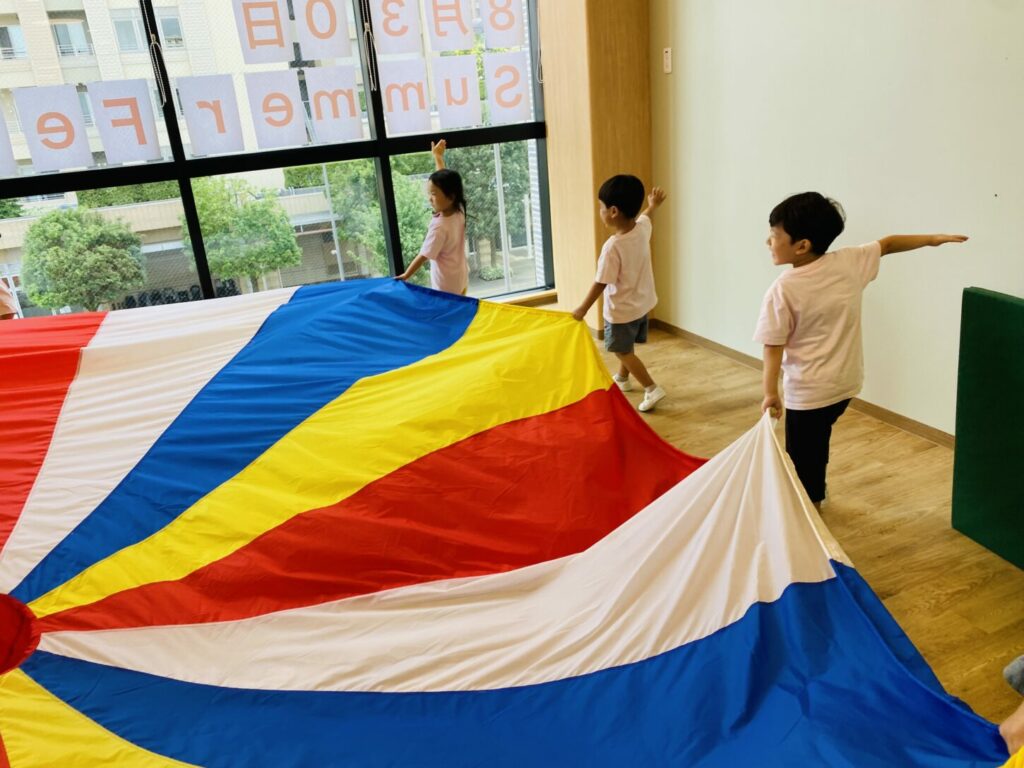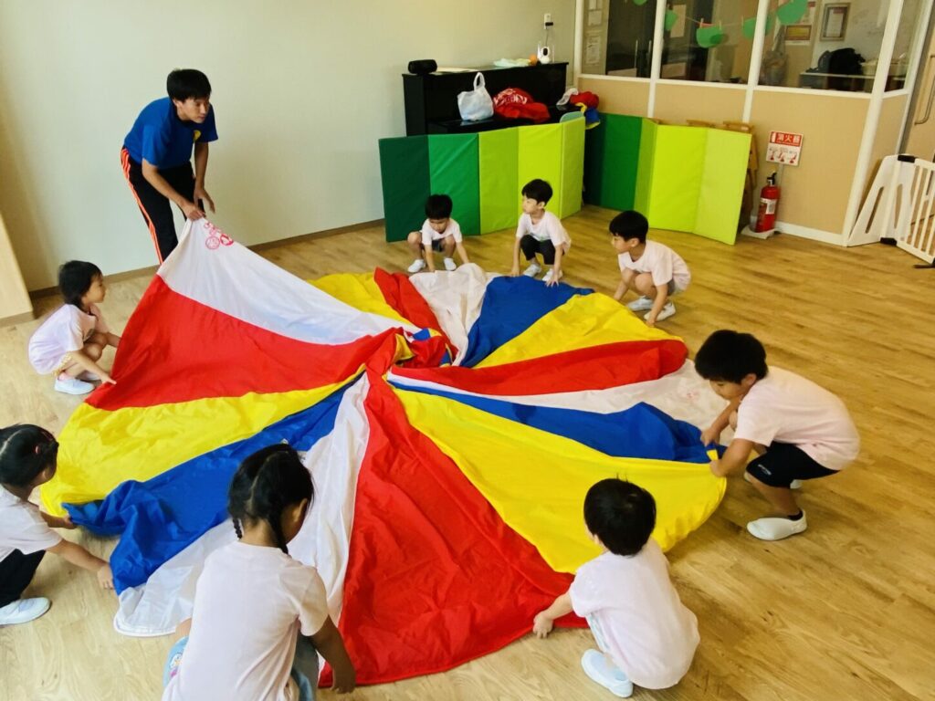 In addition, partner rhythm exercises are incorporated, allowing the children to enjoy coordinating with their friends while experiencing the sense of unity that comes from moving together with the entire parachute.