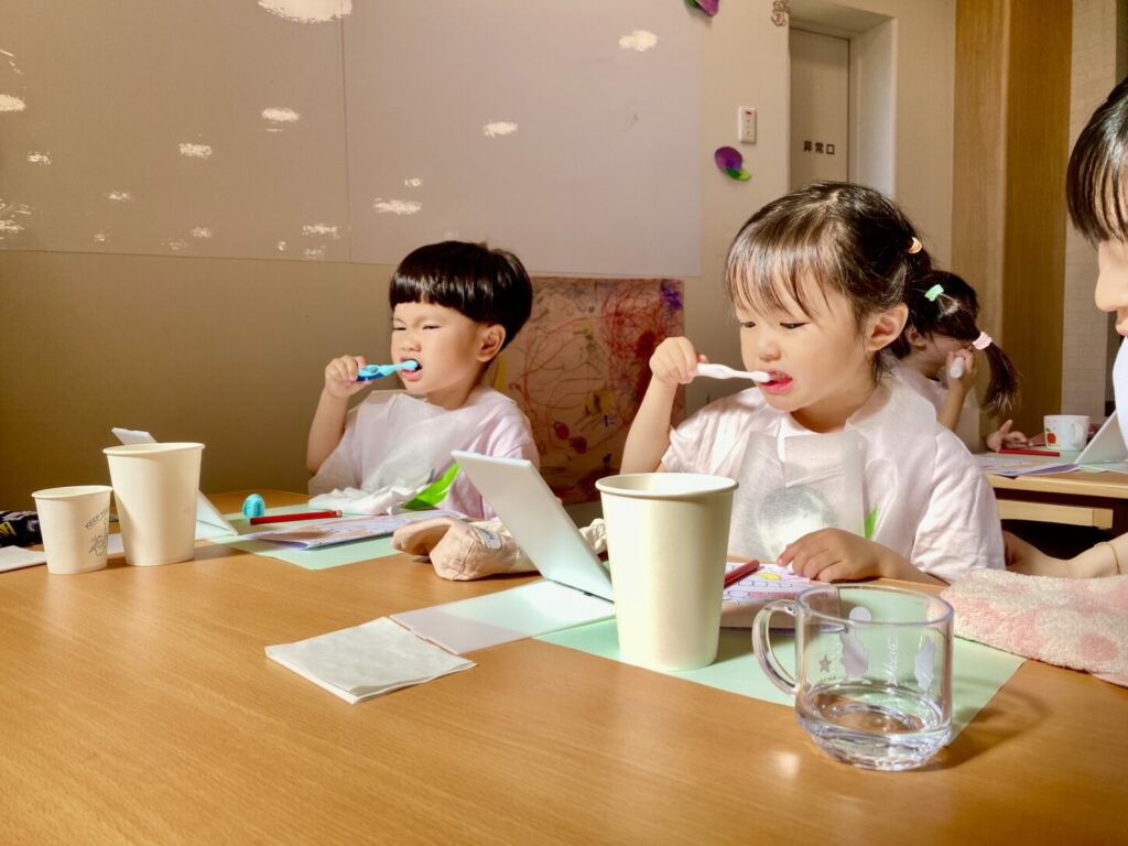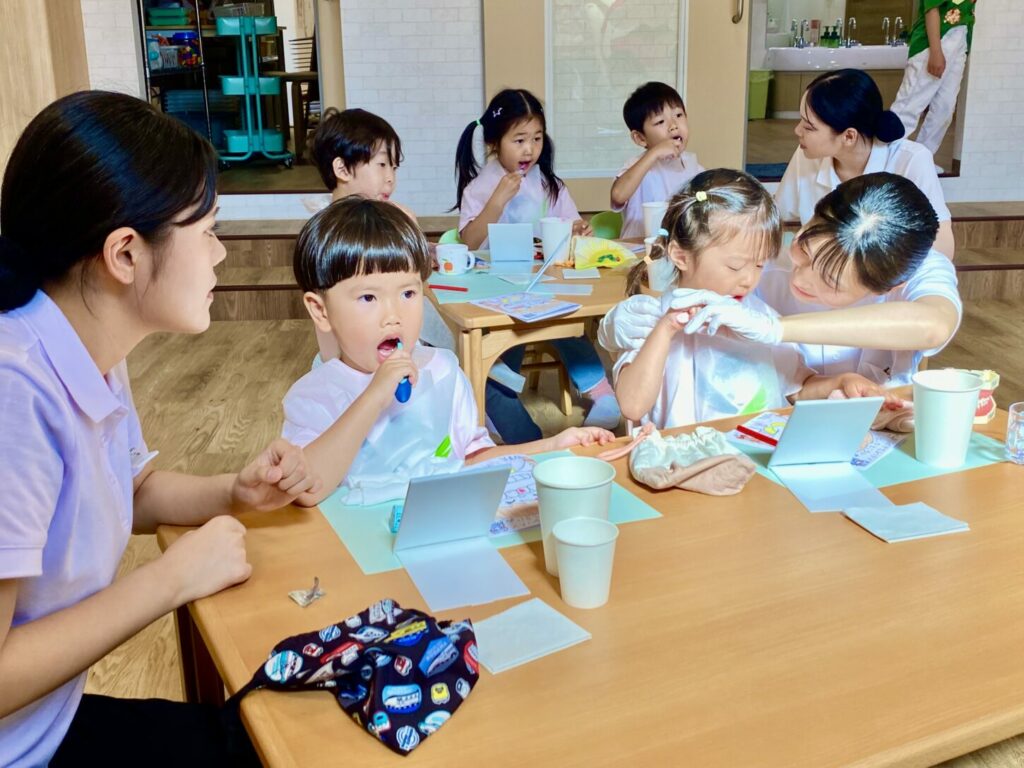 さらに、K2とK3の子どもたちは栗原学園グループの一員であるアポロ歯科衛生士専門学校の学生が行う歯みがきワークショップに参加しました。ワークショップでは、正しい歯みがき方法を実践的に学び、口のすみずみまでみがくことや砂糖の摂り過ぎを控えることの重要性を理解しました。