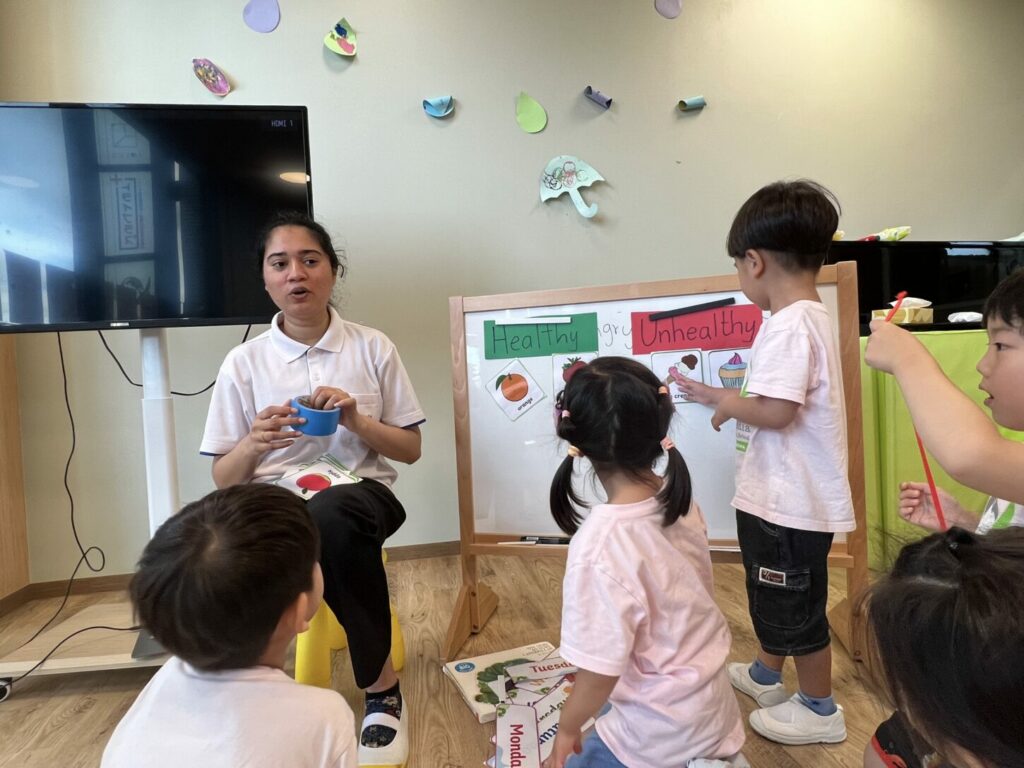 Page by page, the children explored the caterpillar’s journey. They reflected on how the tiny caterpillar ate various foods before transforming into a bigger, stronger butterfly. These conversations supported the development of key IB Learner Profile traits such as Thinkers, Knowledgeable, and Inquirers.