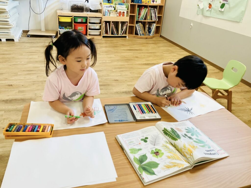 市場見学と調査を通じて学んだことをもとに、子どもたちは葉っぱの図鑑や本を使って、大きさ・形・色の違いに気づきました。その観察をもとに、子どもたちは自分だけの葉っぱの作品を描きました。どの作品も、想像力と新しく得た知識が反映されたものになりました。