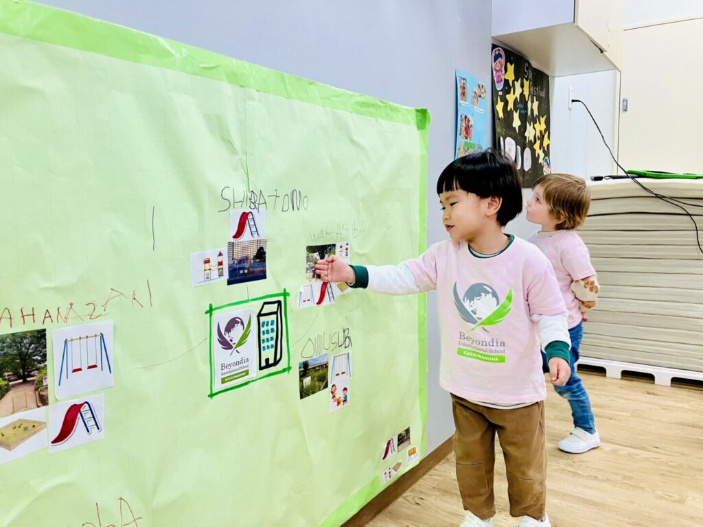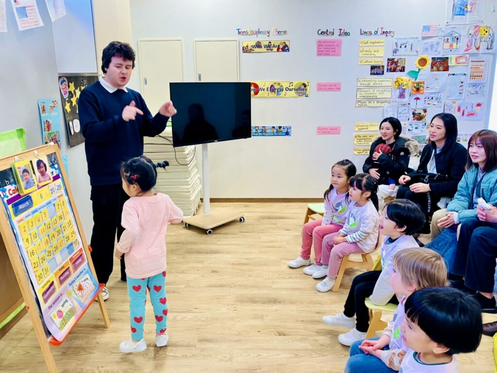 最初に K1 クラスがスタートし、朝のサークルタイムで一日を始めました。その後、特別なグループ Show & Tell の時間があり、子どもたちは2つのグループに分かれました。それぞれのグループが、今月取り組んでいる公園のポスターを発表しました。自分の好きな公園や、その公園のどんなところが好きかを一人ずつ説明し、先生や保護者、友達からの質問にも答えました。子どもたちはしっかりと立ち、堂々と話すことができていて、本当に感心しました。