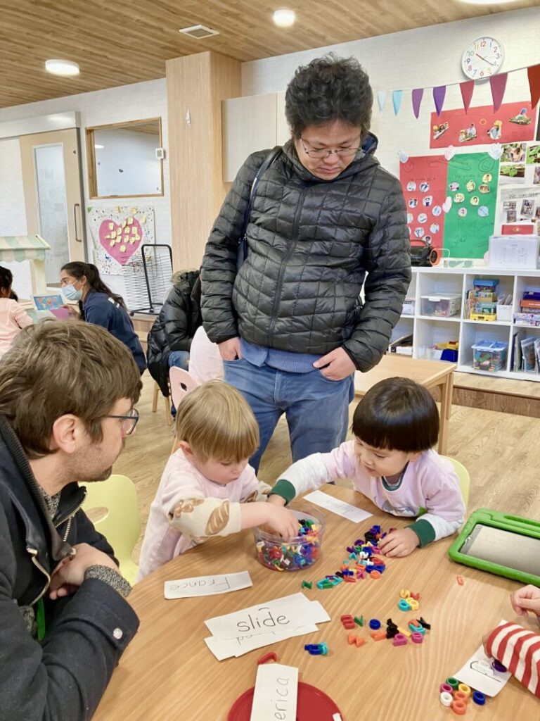 その後、3つのアクティビティステーションに取り組みました。1つ目のステーションでは、プラスチックの文字を使って単語を作る活動、2つ目は公園の遊具を塗り絵する活動、3つ目は地図のパズルを完成させる活動を行いました。
