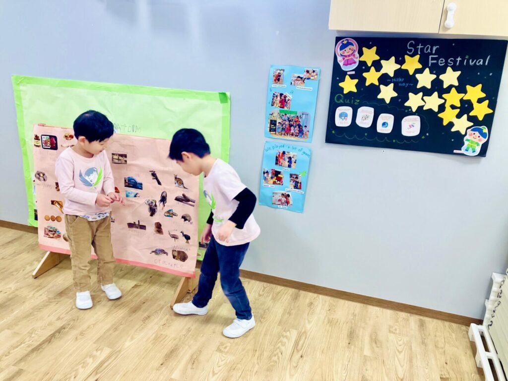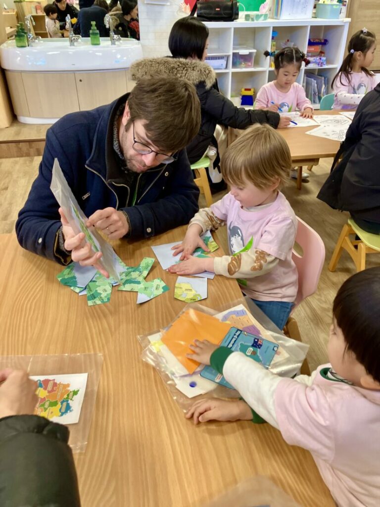 そして、子どもたちは保護者と一緒に「夢の公園」を作り、公園の名前を考えました。親子でアイデアを出し合いながら取り組み、とても楽しい時間を過ごしました。最後に、3つのステーション活動を行いました。1つ目は地図のパズル、2つ目はワードサーチ、3つ目はオーストラリアと日本を比較するポスター作りでした。