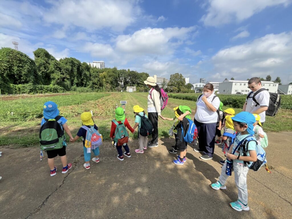 At the strawberry greenhouse, the children wore gloves and worked hard planting strawberry saplings. They learned about the process of growing food. Afterward, K2 and K3 had a special tour to see banana trees, grapevines, fig trees, and Japanese pears.