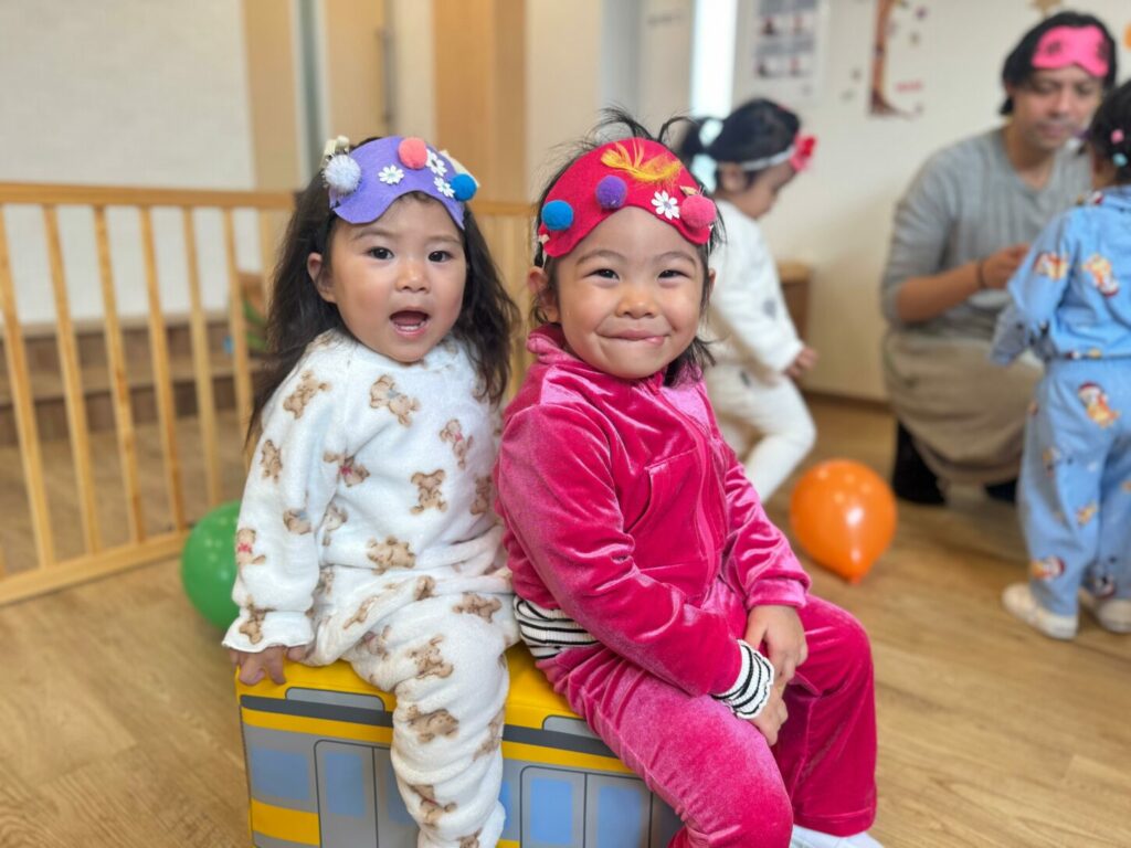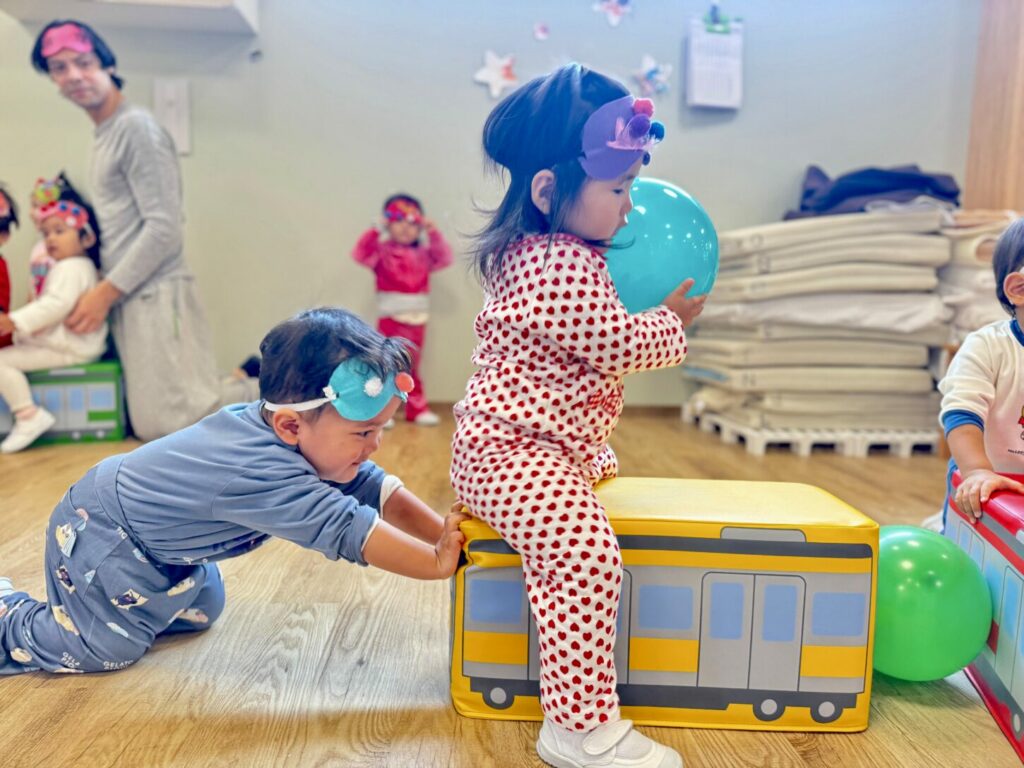 おやつの後は、にぎやかな遊びの時間を楽しみました。風船で遊んだり、電車で遊んだり、ダンスパーティーも行いました。「Sleeping Bunnies」に合わせて踊る姿はとても可愛らしかったです。