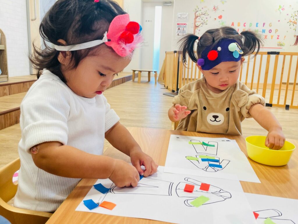 プリクラスでは、少しレベルアップ!スティックのりを使って、フェルトの形をパジャマのいろいろなところに貼りつけました。のりの使い方もとても上手になり、飾りを丁寧に貼る姿に子どもたちの成長を感じました。毎日少しずつ、できることが増えています。
