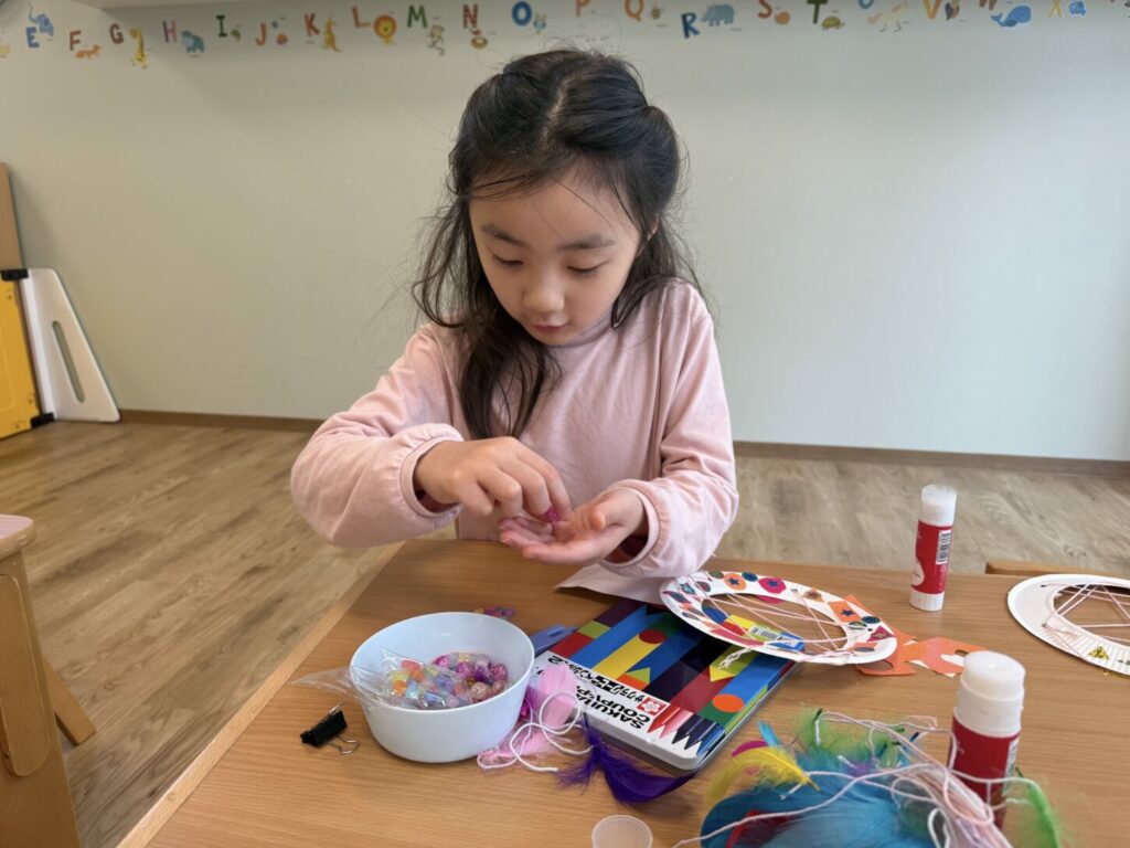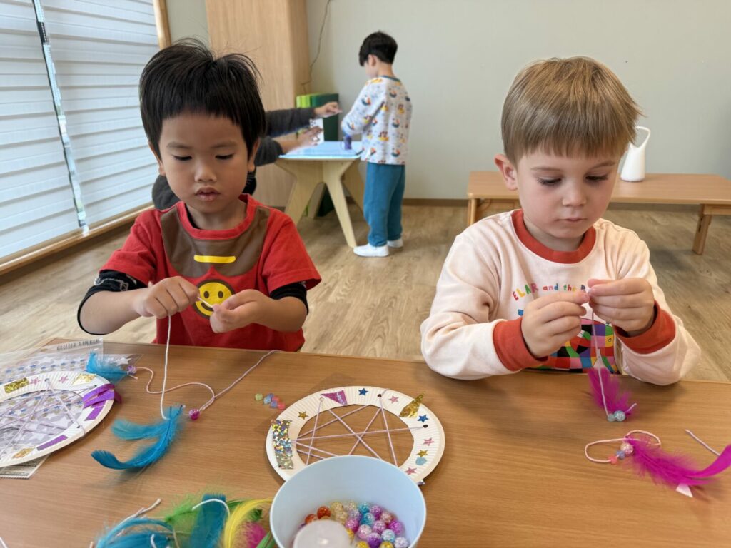 Kinderクラスでは、朝の時間にクラフト活動から一日をスタートしました。K2とK3の子どもたちは、紙皿に毛糸や羽、ビーズを使って美しいドリームキャッチャーを作りました。それぞれの子どもが、自分で材料を選び、組み合わせながら素晴らしい創造力を発揮していました。