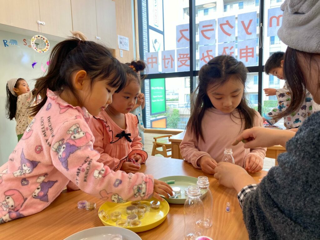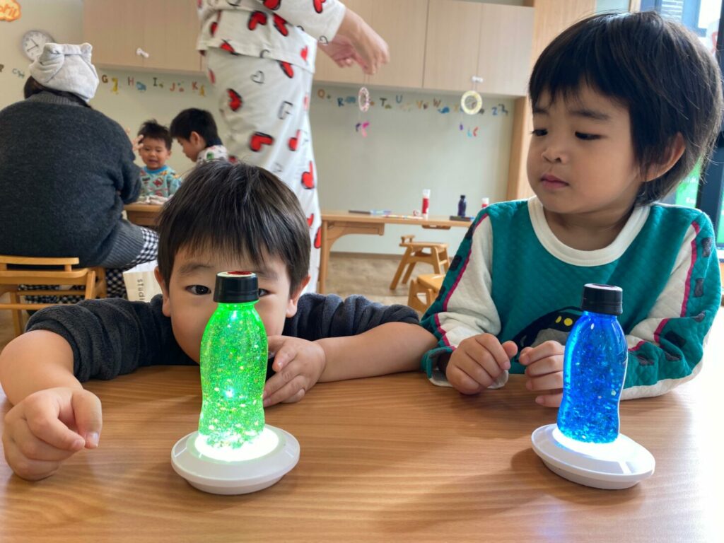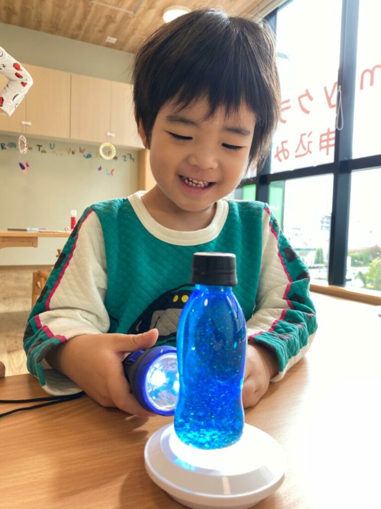 この活動は、IBテーマ「How the World Works」の「光」に関連させました。Kinderの子どもたちは、色やラメを入れたギャラクシーセンサリーボトルを作りました。ライトを当てたり、光のテーブルに置いたりすることで、光が反射したり動いたりする様子を観察しました。キラキラ光る様子に子どもたちは夢中になり、楽しみながら実験をしていました。