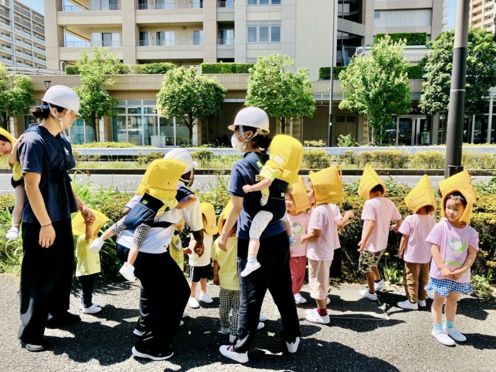 We hold monthly drills simulating various situations, such as earthquakes, fires, and intruders. Staff carefully guide children in both English and Japanese so that they understand the situation and can evacuate calmly.