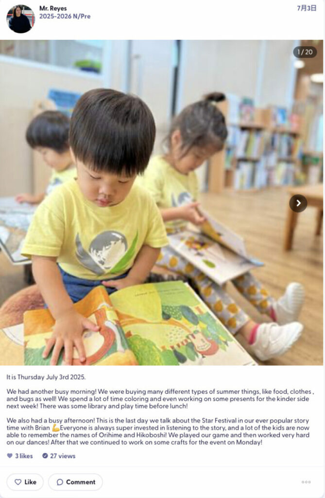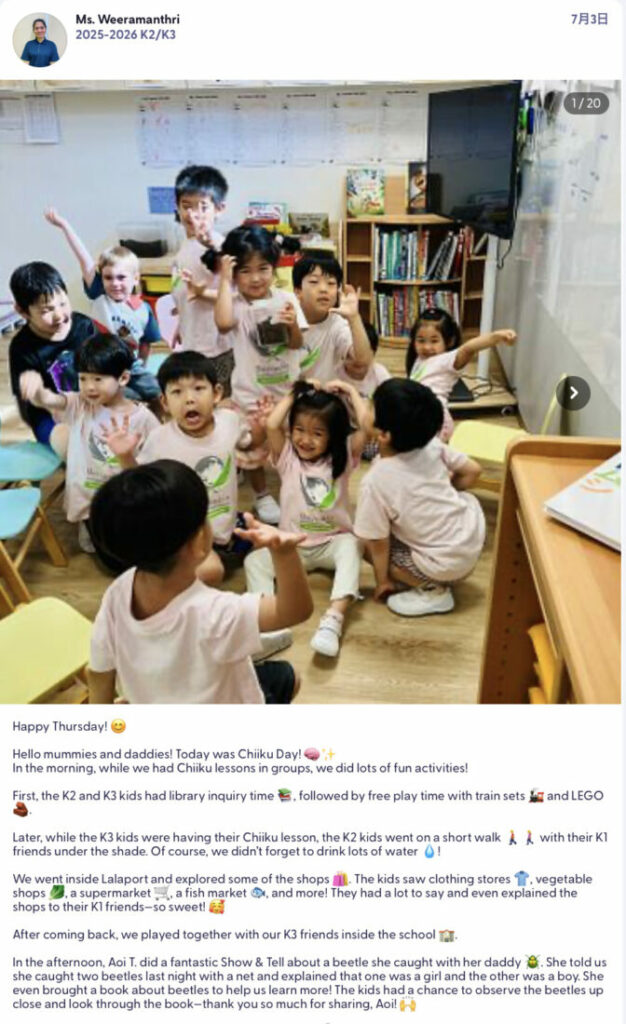 The school delivers daily activity reports with photos from the English teacher via the dedicated app (Class Dojo). This allows families to see what activities their child participated in that day, fostering bedtime conversations and daily reflections. It has been very well received by parents.
