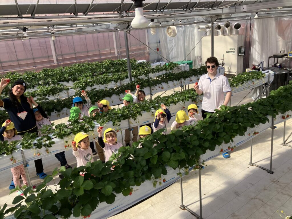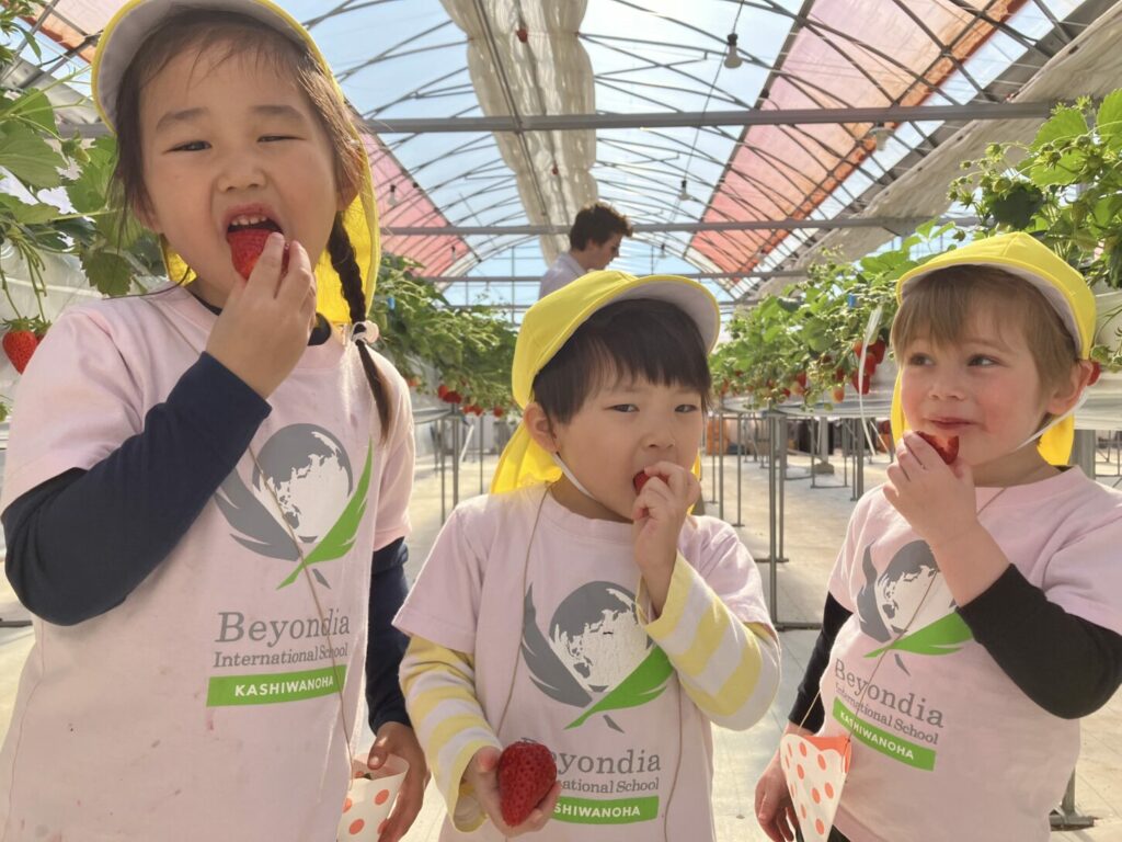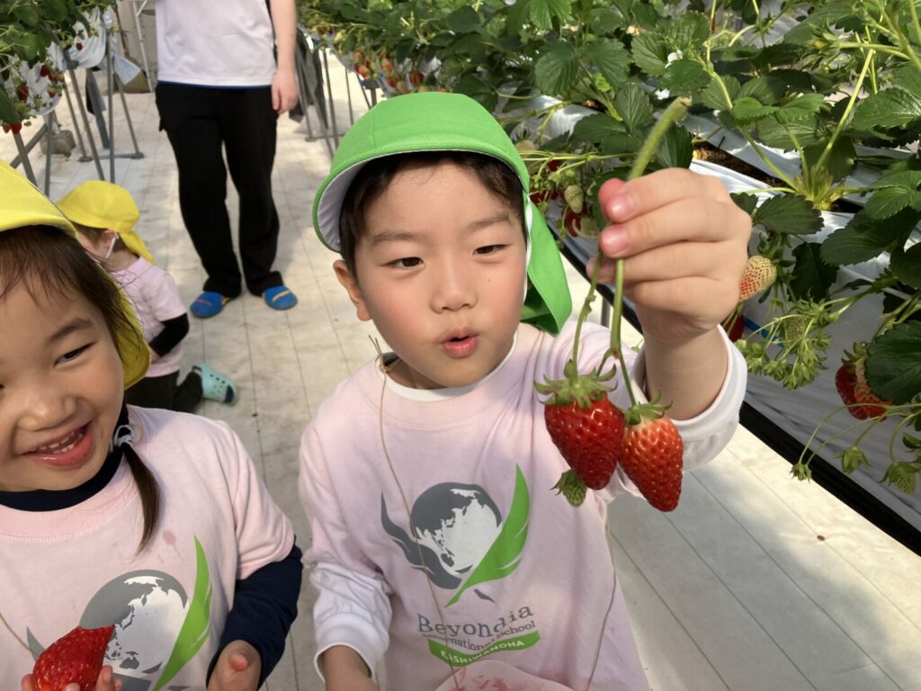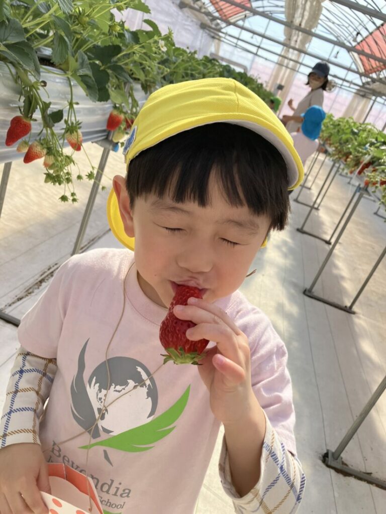 Kinderクラスの子どもたちは、9月に植えた いちごをついに楽しむことができました。毎月、いちごの成長を見に行きました。余分な葉を取り除いたり、小さなブラシを使って受粉を助けたりしながら、大切にお世話をしました。