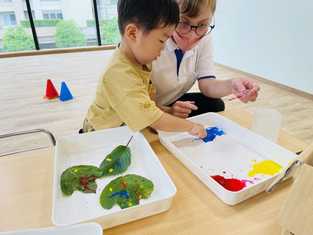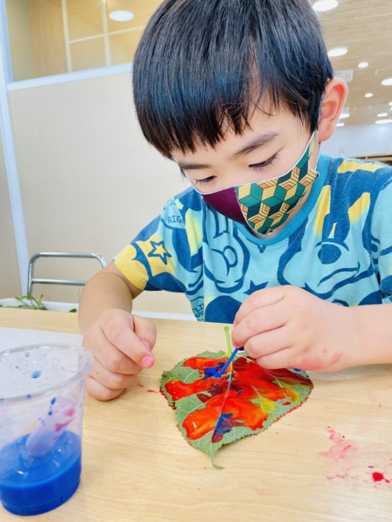葉っぱの上で色が混ざり合う様子を