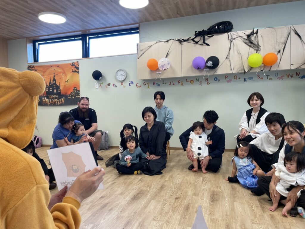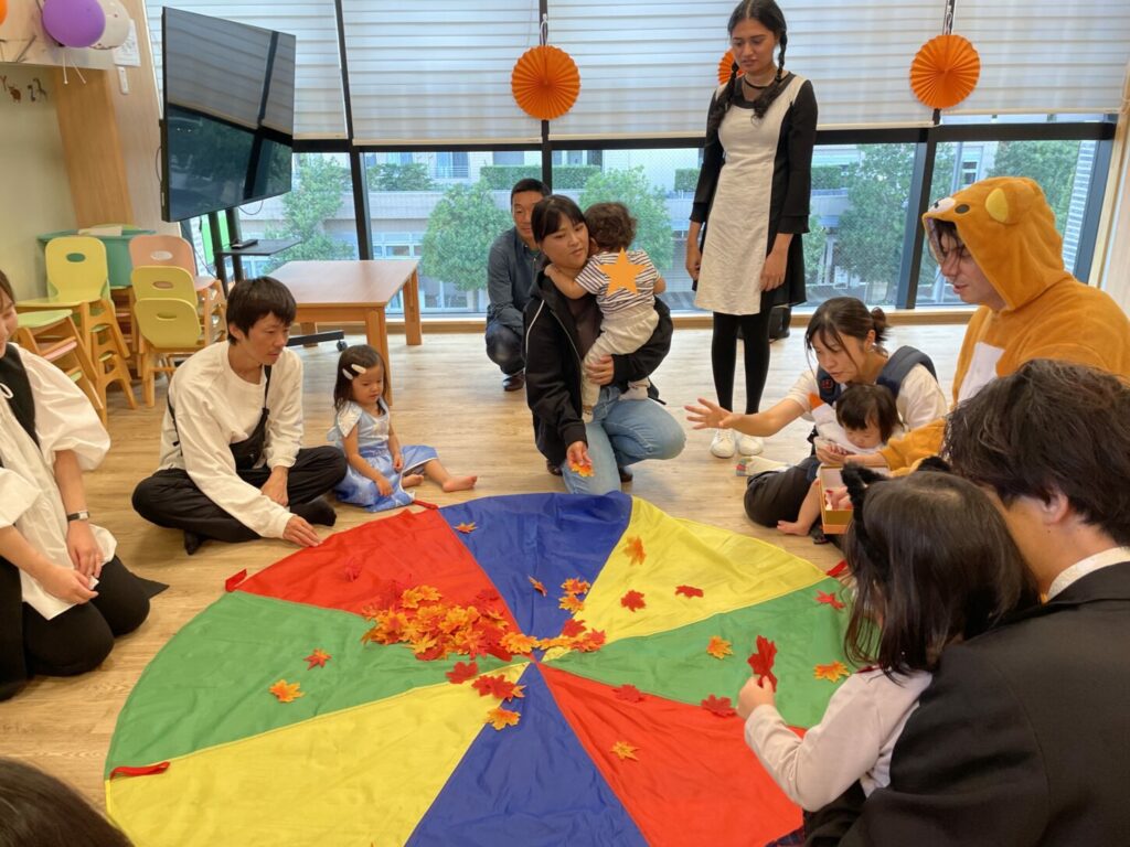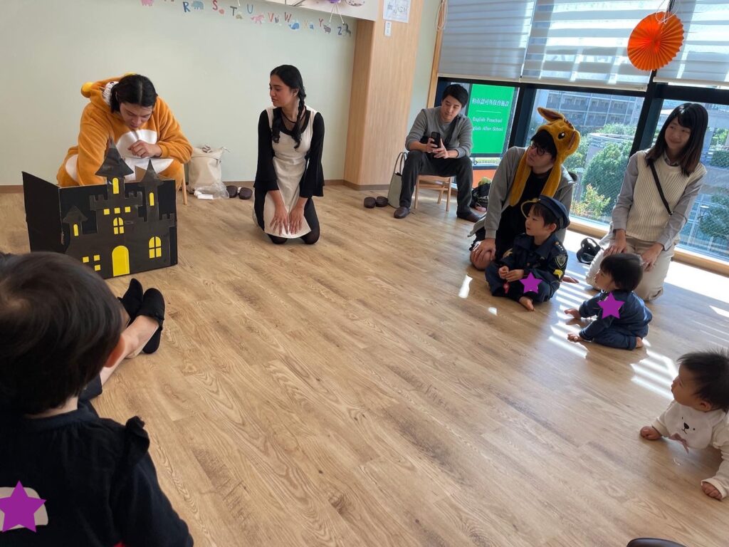 イベント恒例の “Paracute” に今回は “Bats” も加わり音楽に合わせて up and downしたり、“Haunted house” が現れたり… Halloween decoration の School で Halloween activityを楽しんでもらいました。