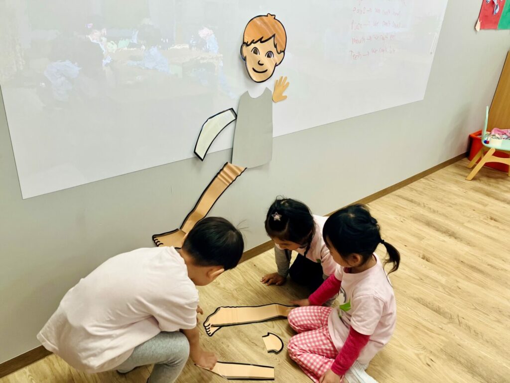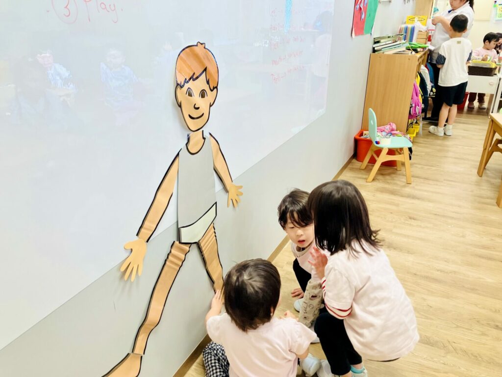 To kick off the unit, we started with a group discussion about the different parts of the body and why we need them. The children were enthusiastic and eager to share what they knew! ユニットのスタートとして、まずは体のいろいろな部分について、そしてそれらがなぜ必要なのかについてグループで話し合いました。子どもたちはとても意欲的で、知っていることを楽しそうに共有してくれました。