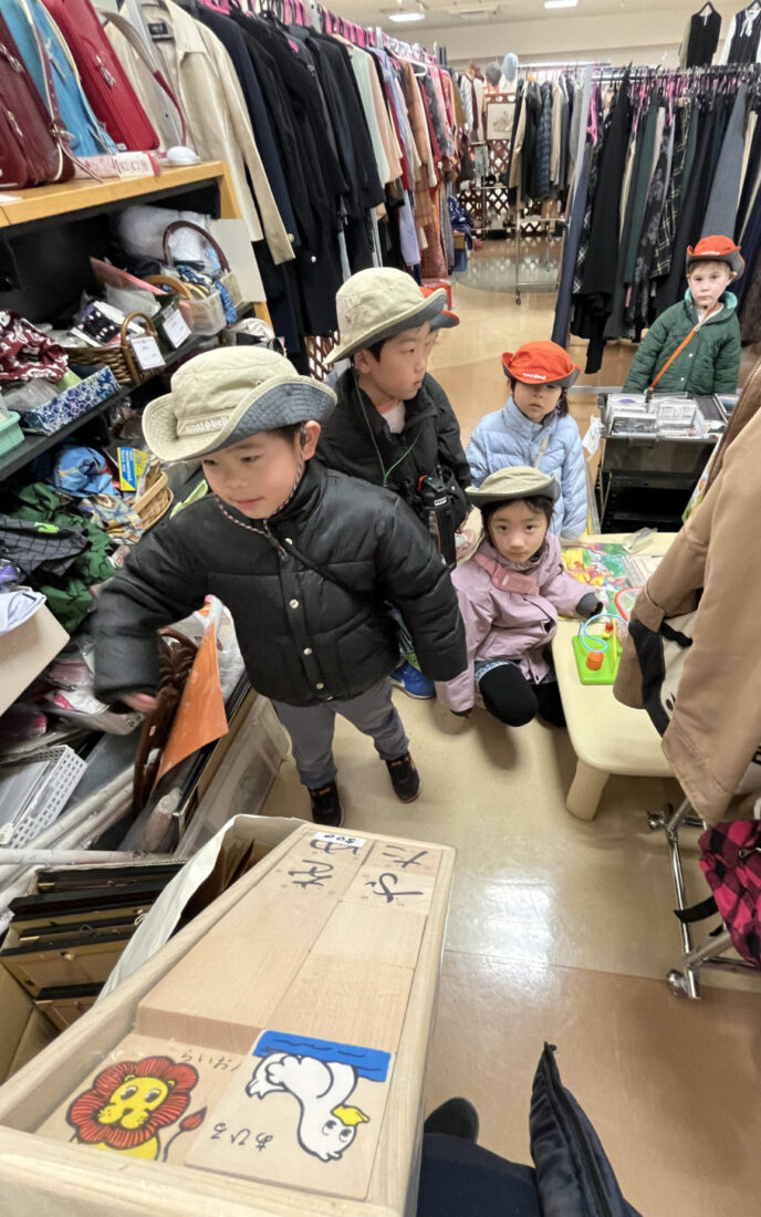見学の最後には、昔のお店で商品がどのように保管・包装されていたかを見学しました。子どもたちは、昔と現在の材料の違いを比べながら、時代の変化について考える姿が見られました。また、リサイクル素材から作られた商品が並ぶショップも訪れ、スクールに持ち帰って遊びや学びに活かせるお土産を選び、実際に購入しました。(和風のお皿やトレー、プラスチックのサラダボール、ひらがな積み木など)