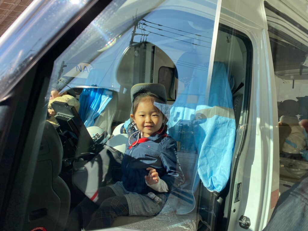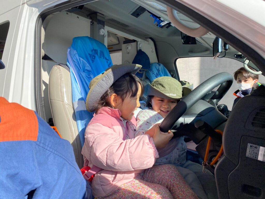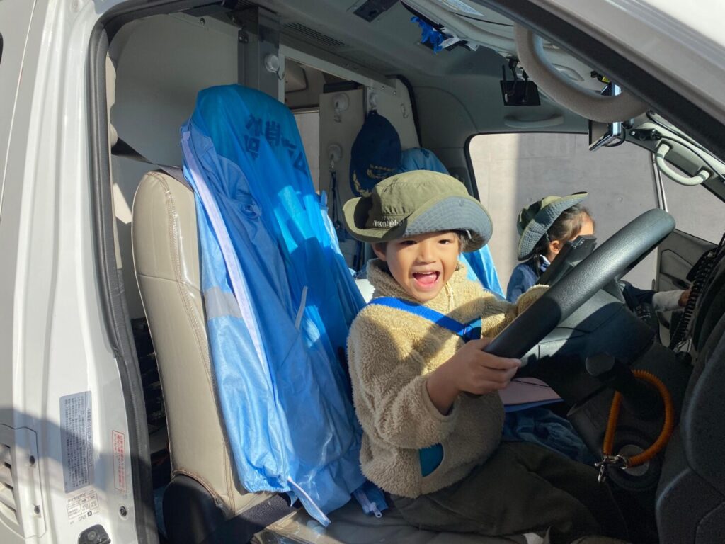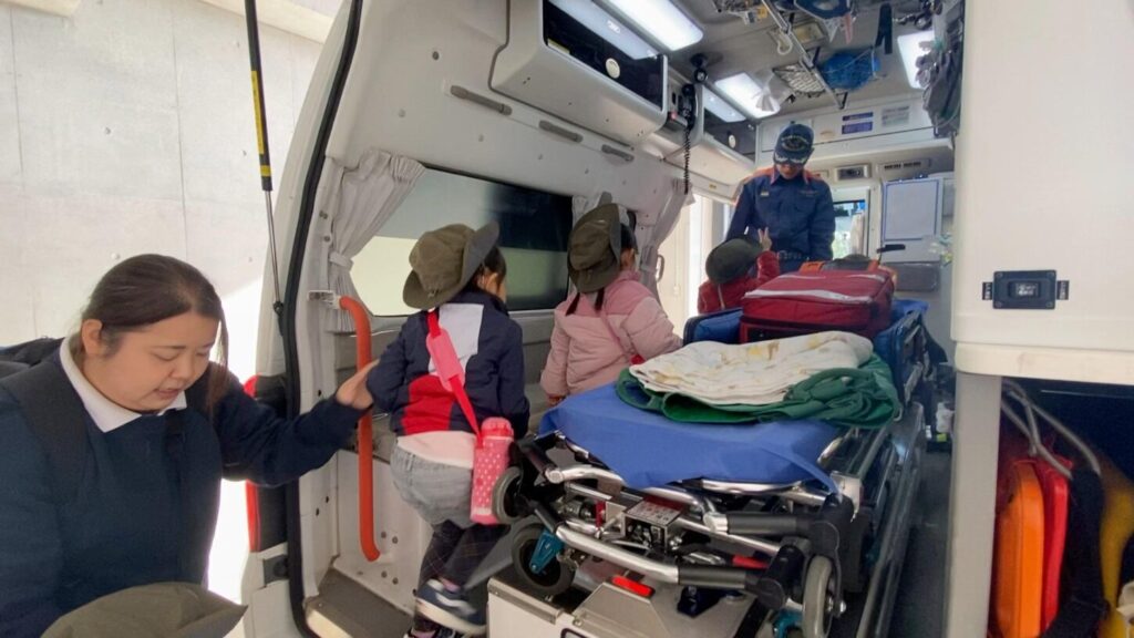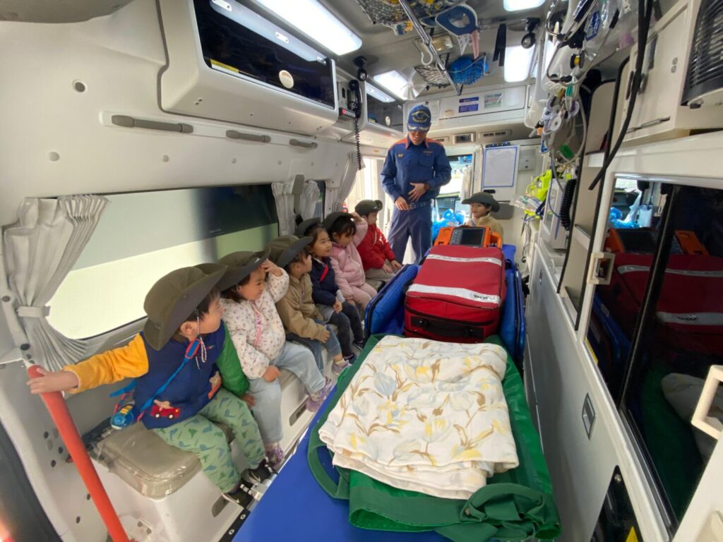救急車の中も見せてもらい、救急隊員さんが人を助けるために使う道具や機械をたくさん見ることができました。実際に脈をはかってもらい、画面で心臓の動きを見た子もいました。子どもたちはとても興味を持ち、たくさん質問していました。