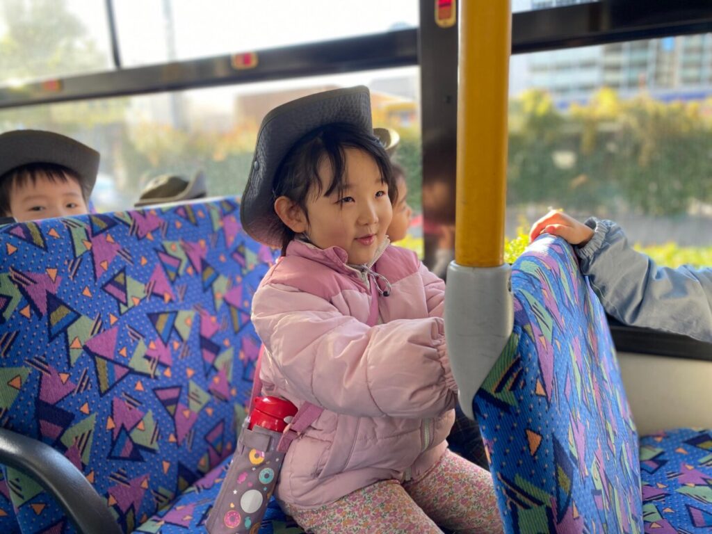 先日キンダークラスで流山中央消防署を見学しました。実際に体験しながら学び、消防士さんや救急隊員さんが地域のためにどのように働いているのかを見ることができた、とても良い機会になりました。消防署までは、電車に乗ってからバスに乗って行きました。子どもたちはとても楽しみにしていて、移動中もよく並び、先生の話をしっかり聞いて行動できました。