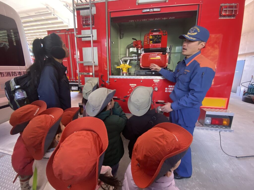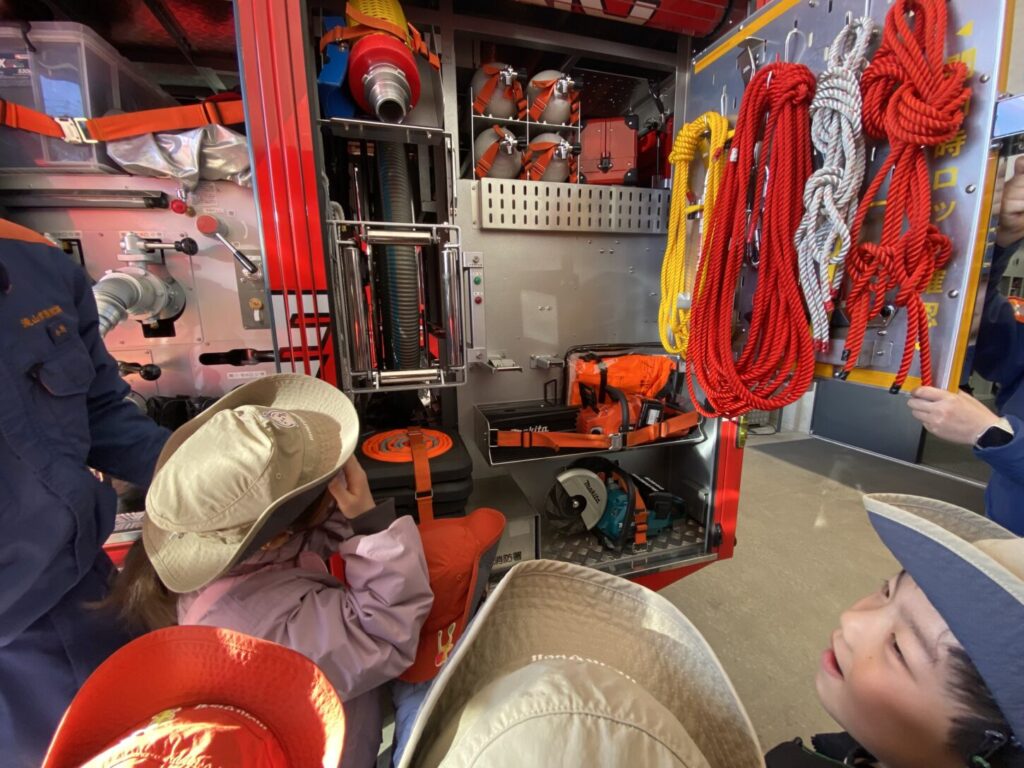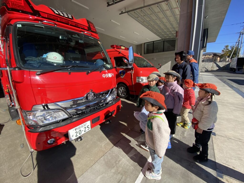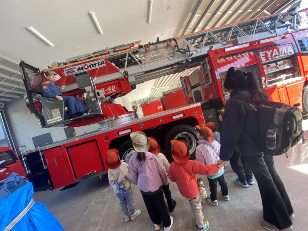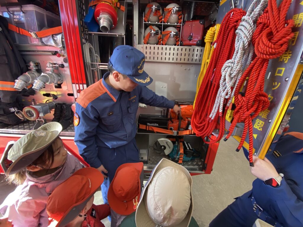 到着すると、消防車が並んでいて、子どもたちはびっくりしていました。消防士さんがあたたかく迎えてくださり、消防署の中を案内してくれました。また、消防車の色はただの「赤」ではなく、「朱色(しゅいろ)」ということも教えてもらいました。