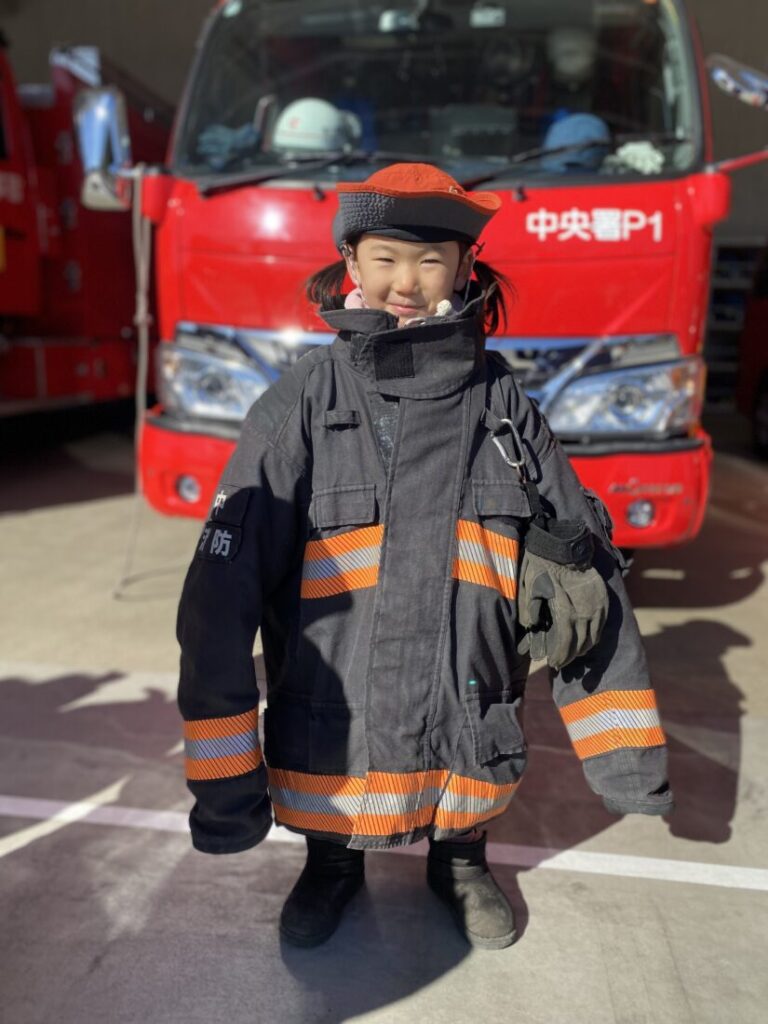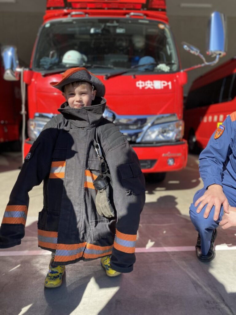 When we arrived, we were amazed to see the fire engines lined up and ready to go. The firefighters welcomed us warmly and showed us around the station. We also learned something new: the fire engines are not simply “red.” The colour is called vermilion (朱色 / shu-iro).